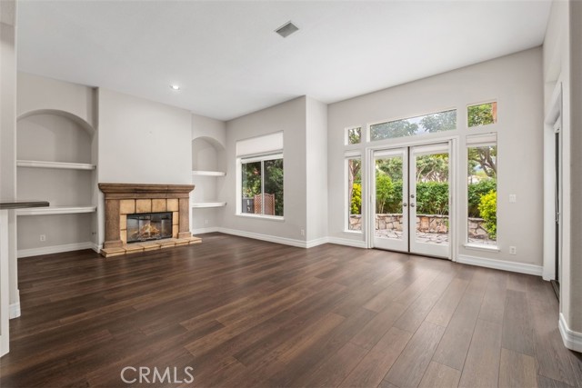 This beautifully upgraded Townhome has it all! Cul-de-sac location, private entrance leads you to this upgraded beauty. Upgrades include newer vinyl waterproof flooring which resembles wood, home painted throughout including all wood and baseboards, and newer hardware throughout. Three skylights lend to this open, bright and airy home which has soaring ceilings and tons of windows. Re-done kitchen includes refurbished cabinets and granite counters, stainless steel appliances, newly installed Bosch cooktop and updated lighting, newer wine cooler, newer large stainless steel kitchen sink and dishwasher, bar seating, and nook area. Home also has soaring two story lighted entry, three ceiling fans, formal dining room, crown molding, and dimming chandelier. Downstairs guest bath with a big wow vessel sink and matching light fixture. Huge great room with fireplace, walk behind wet bar with 14-foot bar. Master bedroom with retreat, walk in closet, two-sided fireplace into master bath, and French doors leading to a balcony with views of Saddleback. Master bathroom with fireplace, dual sinks, and new frameless shower door. Guest bathroom upstairs all re-done with travertine including shower and inside laundry upstairs. Lovely laid out stone back yard, retractable screens on French doors f