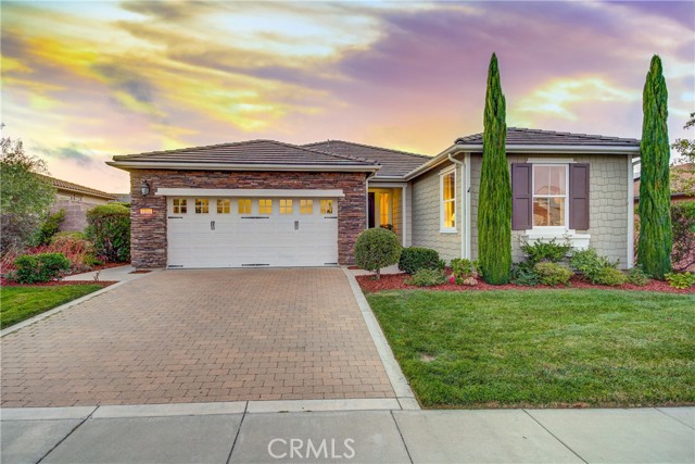 Stunning, single-level, 3/2, Monterey model with over $175k in custom luxury upgrades. This home has air conditioning, SOLAR, and gorgeous hickory hardwood floors. This turnkey home is loaded with custom features, including a gorgeous great room with a gas fireplace and built-in media center, large windows which bring in an incredible amount of natural light, open dining area with sliders to the incredible outdoor oasis featuring cement and paver patios, gas plumbed fire pit, peaceful and serene water fountain, lots of space for entertaining and a wonderful garden area that gets just the right amount of light for fruit, citrus trees and your own little vegetable garden. The gourmet kitchen has everything the cook might need, including a large Caeserstone center island, breakfast bar, espresso glazed cabinets, gorgeous travertine backsplash, Jenn-air stainless steel appliances, including a five burner stove top, pantry, pull out drawers, and more! The primary suite is on the West wing, and includes a nice big walk-in closet and primary bath with travertine floors and walk-in shower, quartz countertops, dual sinks, and private water closet. Travel down the East wing, and you will find an indoor laundry room with storage, a beautiful guest bath with traverti