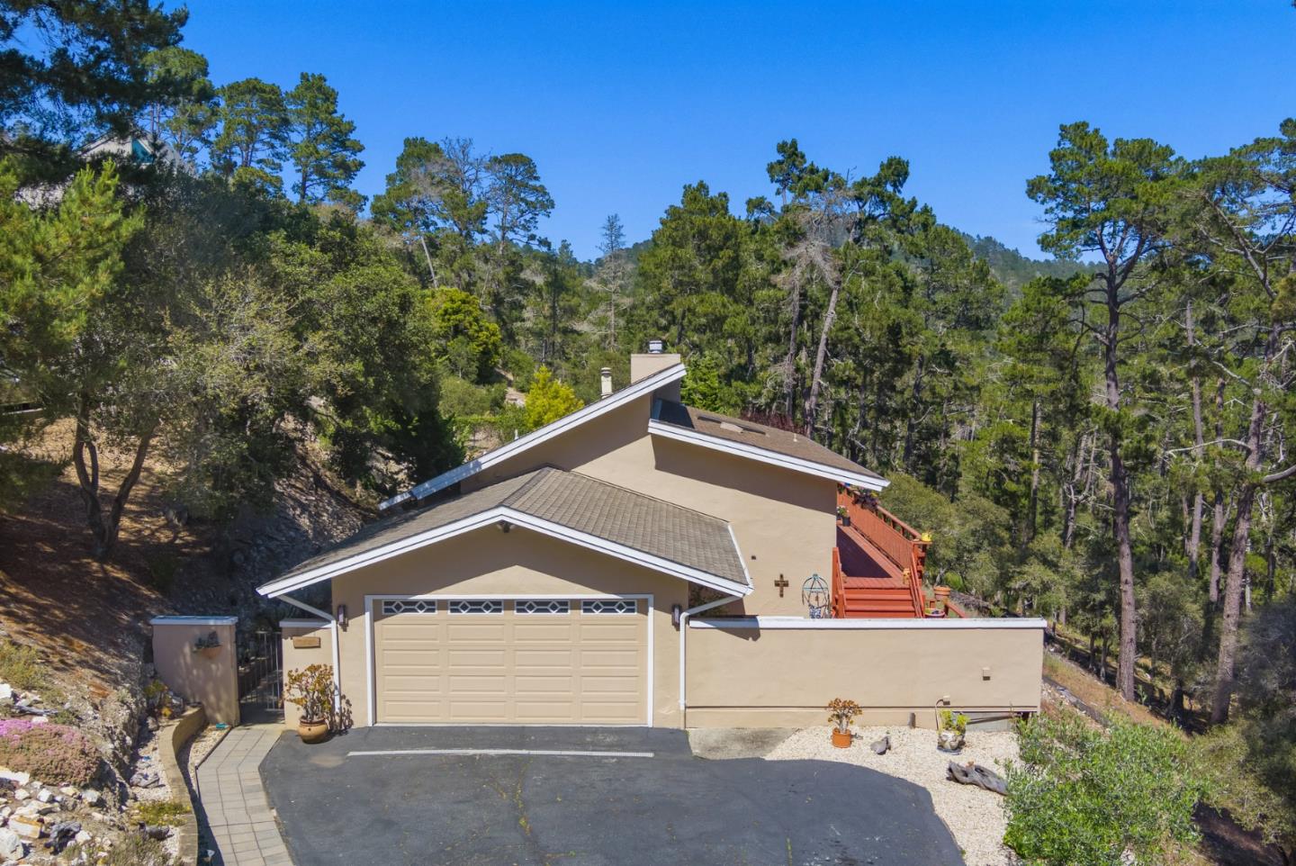 Large Carmel home on an oversized lot with valley views, privacy and charm. Located on a quiet street in the sunbelt of carmel, this 4 bedroom, 3 bath home in the River school district has an abundance of natural light and a spacious floor plan with over 2,500 sft of living space. Highlights include vaulted ceilings, a gorgeous stone fireplace, skylights providing light and bright interiors, walk in closet, a 2 car garage, a large stone patio and multiple decks for outdoor entertaining. The split level floor plan allows for wonderful separation of space between the primary suite (which boasts it's own office) and the lower level that has 3 additional bedrooms, 2 baths, a family room and separate kitchen. Welcome home to Carmel living!