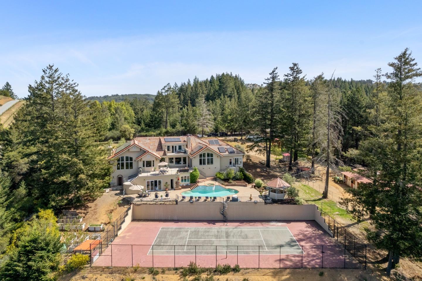 Magnificent estate with breathtaking mountain, coastal & ocean views. Automatic gates to circular driveway flanked by a sunny olive grove. Formal entry opens to the living room, fireplace and picture window framing the views. Gourmet kitchen features two islands, copper farmhouse sink, copper breakfast bar, spacious casual dining. Great room with vaulted open beam ceiling & formal dining room. Office staircase leads to upper level primary retreat with gas fireplace, private balcony & spa-like bathroom. 2nd primary suite on main level, flooded with light from the huge arched window. Ensuite bathroom with walk-in closet, access to the workout/spa/solarium, full bath & sauna. Lower level guest or in-law quarters with full kitchen, recreation room, 5th bedroom or den. Pool & spa with waterfall, gazebo, tennis court, horse barn & riding arena, raised garden beds. 4 car garage with Tesla charger, 28.28 kW solar & 4 Tesla batteries. Smart home via Control4 home automation, commercial WIFI.