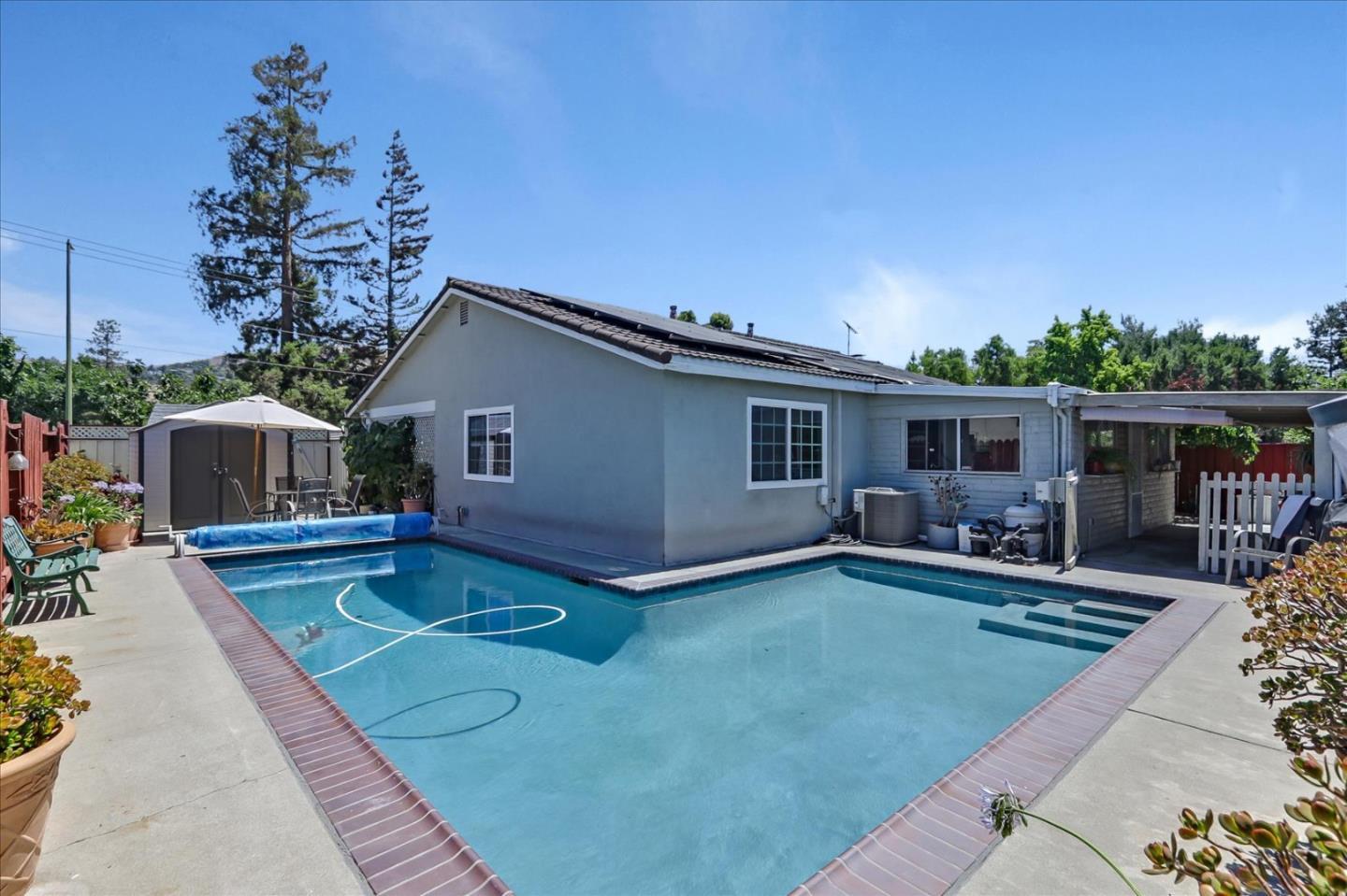 Welcome to this long loved 3 bd, 2 ba home with gorgeous L-shape pool in a resort like backyard featuring mature trees and foliage. Front yard is view of SJ Country Club Golf Course. No obstruction from another house in front yard. Owned solar panels on the roof are an added bonus which lead to low Electrical $60/year, Gas $37/month, Water $60/mo. Updated kitchen with granite and bamboo flooring along with 2 updated bathrooms, one with jetted jacuzzi tub in hall bath. Primary bath has oversized updated tiled shower. Other features include recessed lighting, and crown molding. The unpermitted addition off family room is great for a workshop or office. Separate formal living room off front entry allows for additional entertaining space. Large front yard is fully landscaped with concrete walkway, with automatic security fence and room for additional parking. Side yard is great for dog run. Great view of the San Jose Country Club hills, close to shops, restaurants and parks.