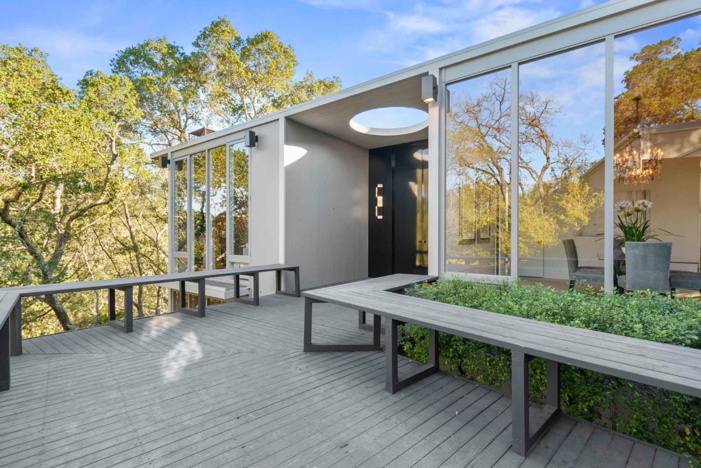 Breathtaking mid-century modern home on grounds of 1 acre, surrounded by nature, a perfect retreat from hustle & bustle, yet close to Hwy 9 corridor, dwntwn Saratoga or LG! Views, views, views! Handsome doors open courtyard & double door entry, an abundance of natural light thru expansive floor-to-ceiling windows. Birch wood plank ceilings & architectural details, copper surround fireplace, sleek & modern finishes in well-appointed kitchen. Lg dining room overlooks front courtyard. Guest suite on the main level, private primary suite on lower level surrounded by tree-studded views in all directions. Lg walk-in closet outfitted w/ designer organizers. Third bdrm has access to private deck. Ultimate in indoor-outdoor living, lush greenery, sculptural oaks, breathe in fresh forest air, be lulled by soothing sound of water cascading in seasonal creek below. Only minutes to top-rated Saratoga schools, shops & dining in quaint dwntwn Saratoga, this one-of-a-kind property is a private oasis!