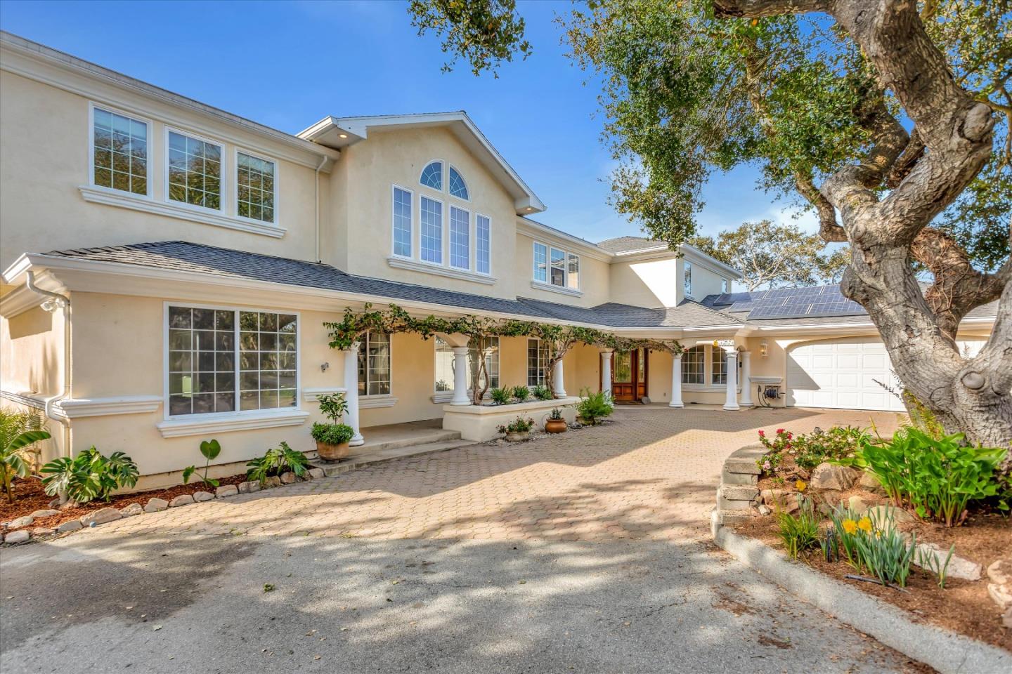 Gorgeous views and sunsets from your western facing backyard and deck. There is more to see from the upstairs rooms including the two primary bedrooms-one has been transformed into the perfect retreat with an office, full bath, and movie theater. Great kitchen, living room and dining room combo. Two bedrooms and a full bath downstairs that is perfect for multi-generational living. Don't miss the perpetual stream in the front yard that enhances the peace and serenity of your new home. There is plenty of space surrounding the property and a long circular driveway. 3248 square feet of living area built on 1.6+ acres in a gated community of 12 homes; you'll enjoy privacy and also be within a mile of 101 with access to Carmel, Monterey and a direct route north to Silicon Valley and the San Francisco Bay Area. There is so much more to discover beyond the virtual tour and pictures. Your search is over, this a great home you'll enjoy for years to come.