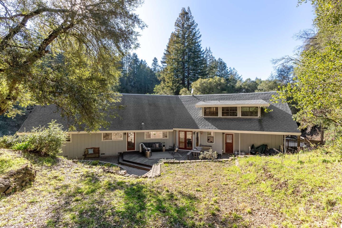 Welcome to this serene home nestled in the majestic Santa Cruz Mountains. Close to everything but away from it all! Ideal location in the top-rated Happy Valley Elementary School District and just a short drive to the beach. As you enter this home, vaulted ceilings and large windows with beautiful natural light invite you in. The main level has multiple bedrooms and full bathrooms (including the primary suite). The interior is everything you dream of in a mountain home but the surrounding acreage will pull you outdoors to enjoy fresh air and gorgeous scenery. The approx 3.5 acres of land are like no other - there are expansive usable areas with luscious lawn and custom hardscaping, a fenced horse paddock, fruit trees, and a seasonal creek that runs through the property. Enjoy the tree lined views while still having the opportunity to soak up the Santa Cruz sun. Recent upgrades include: furnace, garage water heater, electrical panel, and a new roof and gutters at the front of home.