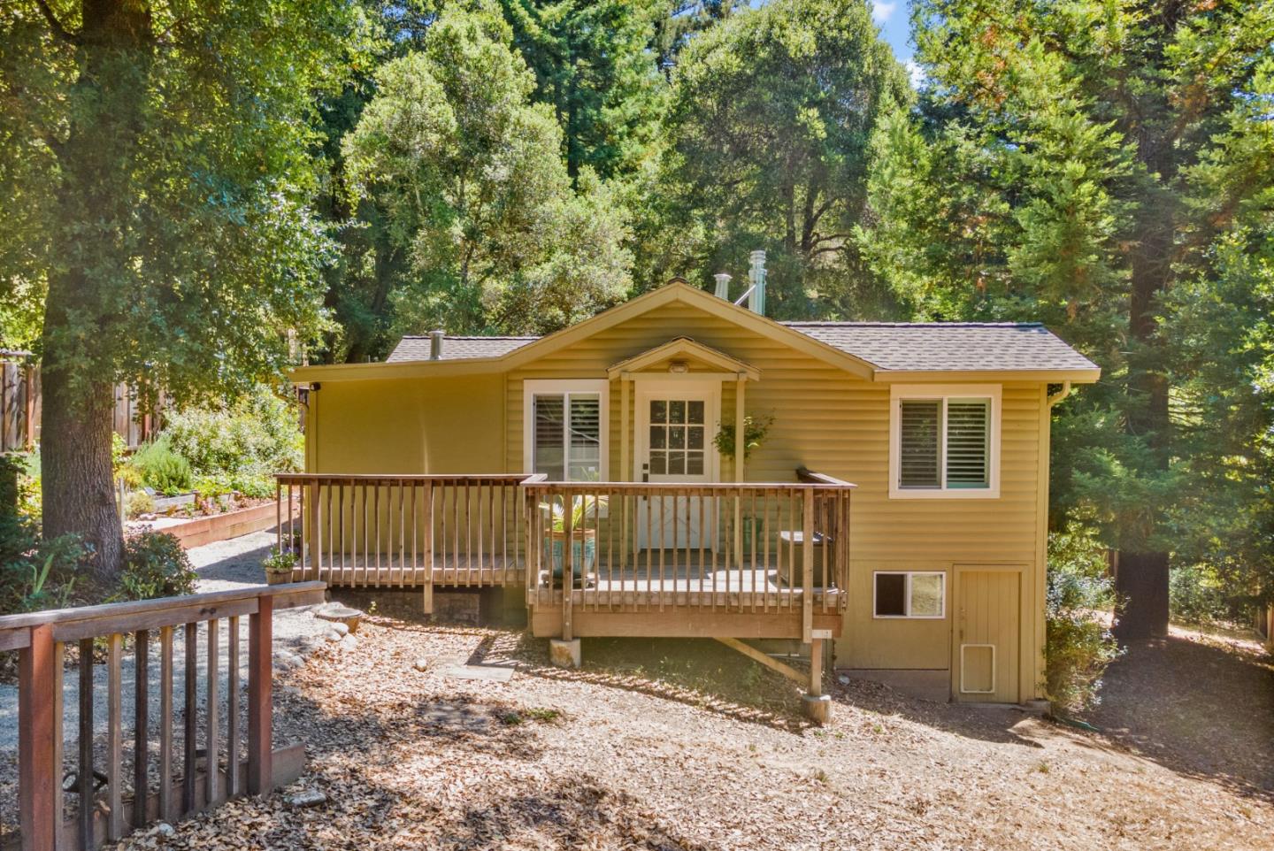 This charming home boasts a spacious living room with a cozy stove and a high vaulted ceiling that opens up to a beautiful deck with ample space for entertainment. The fully stocked kitchen with plenty of storage and counter space is perfect for cooking and hosting. The office space or dining room is surrounded by windows that provide natural light and views of the trees. The primary bedroom features plush carpeted floors, a built-in closet, and an ensuite. The second bedroom with carpeting is ideal for guests or as a nursery. The lovely yard is surrounded by trees, offering privacy and a serene ambiance. The whole house has AC and on-demand instant water heater and tank water heater backup that can be run off the generator, with an easy plumbing bypass handle to switch between the two. The home's easy access to Hwy 9 makes it an ideal location for commuters heading into Silicon Valley and day trips to the beach. Nearby, Boulder Creek offers boutique shopping and delicious restaurants.