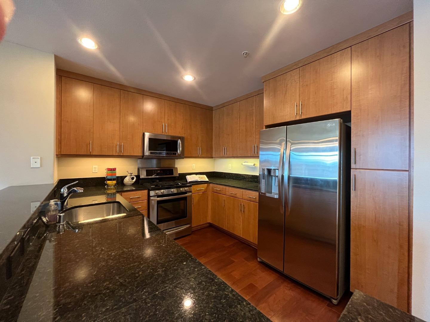 Jack London Square 2 bedroom + office, 2 bathroom penthouse with protected views on the quiet side of the building. Sunlight floods the huge primary suite which features a custom walk-in closet plus second oversized closet. The luxurious primary bathroom has an extended shower and dual vanities. The second bedroom includes a custom walk-in closet and is positioned for privacy. Bonus space makes a great office! Prepare gourmet meals on the gas range and enjoy upgraded stainless steel appliances, tons of storage, and a serving ledge overlooking the open dining / living space. Appreciate the industrial chic finishes like concrete ceilings and wall accents, wood floors, installed ceiling fans, and contemporary lighting. In-unit laundry. Tandem parking in shared, secured garage. Additional secured private storage. Entertain guests on the rooftop deck with BBQ / outdoor kitchen and panoramic views. Convenient access to deck and garbage shoot from unit. Plenty of street parking for guests.