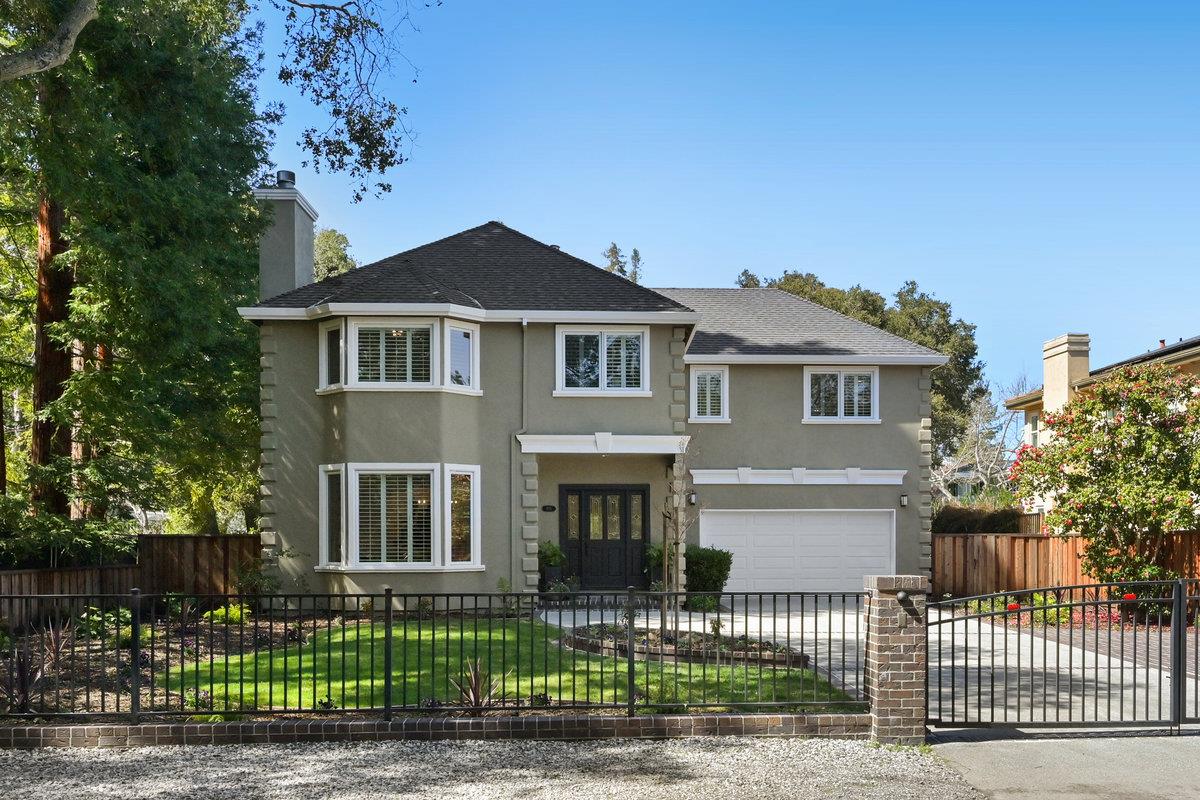 Graceful, elegant traditional five bedroom house with expansive front and rear gardens on a tranquil street. This truly stately home offers four generously sized bedrooms upstairs, including an enormous primary bedroom with a balcony, cedar lined walk-in closet, additional closet, and spa-like bathroom. The junior primary en suite bedroom downstairs is adjacent to a private office with garden views. Excellently laid out floor plan with a formal living room featuring a fireplace; formal dining room with a service nook; kitchen with a breakfast room, large dining island and workstation; and an adjoining family room/great room with another fireplace and a wet bar. Conveniently located midway between San Francisco and San Jose, close to all Silicon Valley namesake high tech companies, excellent restaurants and shopping, and in the renowned Menlo Park School District.