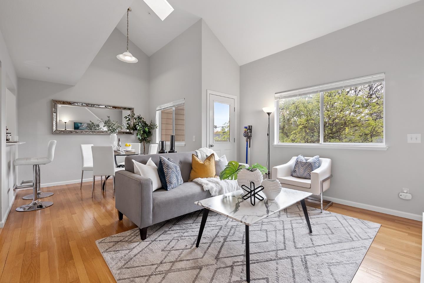 This charming 2 bedroom, 1.5 bathroom condo is situated in a central San Carlos location, just a short walk to vibrant downtown San Carlos and the Caltrain station. Inside, main level of the home features an inviting open living space with eat-in kitchen, dining area and living room with vaulted ceilings. One bedroom and half bathroom are located on the main level, with the primary suite located upstairs, enjoying a spacious en suite bathroom, large picture windows drawing in natural light, and another set of windows looking out into the living area, creating a wonderfully open and airy space.  The home also boasts a 2-car garage with washer and dryer. Enjoy the convenience of living close to restaurants, shops and transportation, while also savoring the comfort and privacy of your own cozy abode. Welcome home!