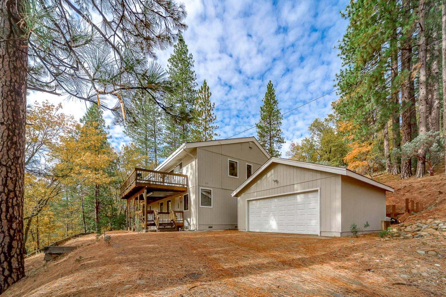 A rare mountain gem! Private setting in Pinebrook, large 0.91 acre lot, and tons of room for family and friends! Close to Pinebrook Lake and located at the end of a cul-de-sac with 4 bedrooms (2 of which are primary suites) + an extra room you can use as a bedroom or office for a total of 5 bedrooms, 3 full bathrooms, 2 living areas, 2 dining areas, a kitchen and kitchenette. The upstairs great room has a wall of windows and wood-burning stove (there's also forced air heat + air conditioning). Also on this level: the dining area, kitchen, first primary bedroom suite, 2 additional bedrooms, and full bathroom. Downstairs in the second living area/rec room, dining area, kitchenette, second primary bedroom suite, and fifth bedroom. Expansive deck, detached 2-car garage plus plenty of additional parking. Enjoy summer days at Pinebrook Lake - there's also a clubhouse, playground, disc golf, and more. Close to Big Trees State Park, Arnold Rim Trail, Bear Valley Ski Area, and Murphys!
