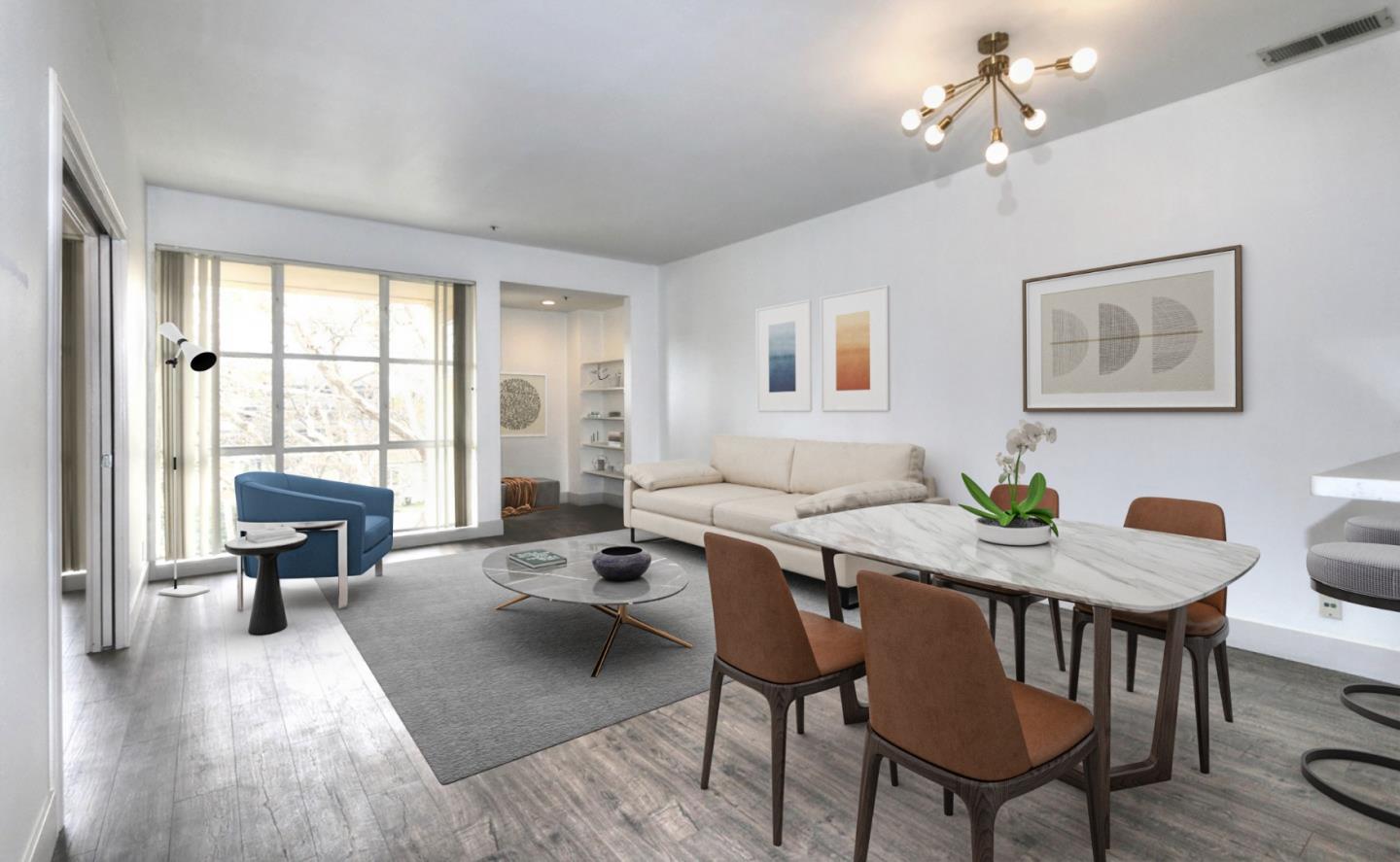Experience the vibrant urban lifestyle at St. James Place in Downtown San Jose. This fully remodeled one bedroom, one bathroom condo features an open floor plan with plenty of natural light. The living room and bedroom boast floor-to-ceiling windows, while the entire condo has high ceilings, creating a spacious and airy feel. The bedroom also includes a walk-in closet for ample storage space. Unit 46 is equipped with modern stainless steel appliances, brand new cabinets, newly installed heating and air, inside laundry, additional exterior storage space, and a kitchen with beautiful quartz counters and porcelain tile. The building has recently undergone upgrades, including a new roof, exterior paint, siding repairs, and the installation of a new elevator system. This unit comes with one designated deeded parking space. Take advantage of the proximity to dining, theaters, SAP Center, Light Rail, CalTrain, and more. With easy access to all major freeways and the International Airport.