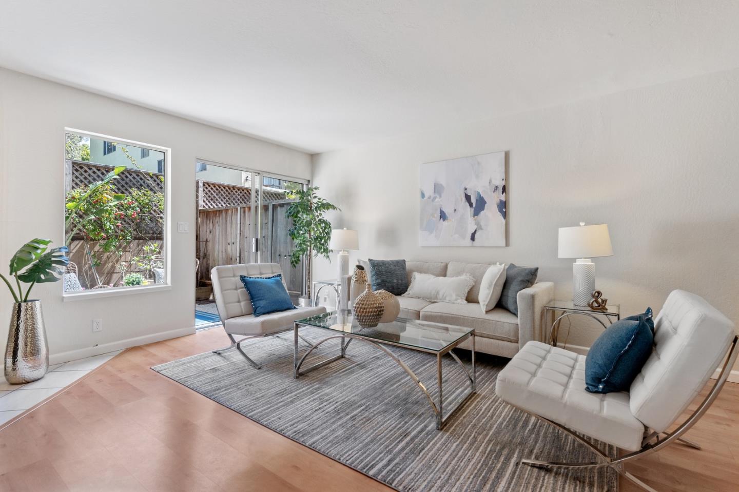 This two-story unit is set at the rear of the complex allowing for ultimate privacy. Outdoor space includes a green space at the front entrance and a private patio adjacent to the living room. You will love the modern open floor plan on the main floor, including a spacious living room with a fireplace, a kitchen with counter seating and a half bath at the entryway. The second story has two bedrooms, a full bath, laundry and hall skylights to illuminate the space further. There is generous closet space throughout and attic storage. Quiet, private and secure, the entrance has an electric gated entrance and no upstairs neighbors. This west of 101 location has easy access to major companies, including Apple, Facebook & Google, as well as Caltrain, SFO & San Jose Mineta International Airports. There is an abundance of custom and historic homes to admire in this friendly, walkable neighborhood. Close to downtown Menlo Park, Palo Alto & Stanford Shopping Center.