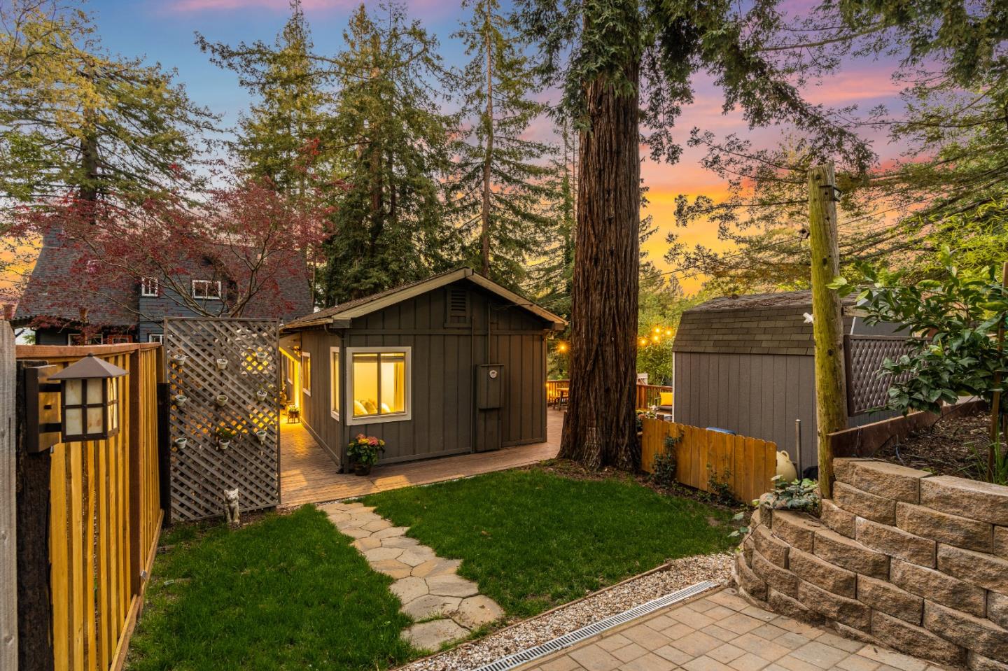 Charming, updated cottage in the sought after Redwood Estates! Light and bright throughout, picture windows, laminate flooring and open kitchen concept updated with beautiful marbled counters, soft-close cabinets Stainless steal Lg Refrigerator, dishwasher oven and induction range with hood. Beautifully remodeled bath with shower. New barn style closet door and light fixtures. 3rd room with laundry/office space or 3rd bedroom. Inviting family room opens to the spacious deck offering views. Tranquil, sunny yard with lovely redwood deck, play areas, hot tub with Redwoods and meadow views. 2 sheds for home office or art studio. Ample parking area for guests and room for RV. San Jose water and Comcast available. Plans for addition available. Just blocks from the village center where you will find Nonno's Cafe Redwood store, Post Office, community pool and playground, Great commute location, 10 min to Los Gatos, Best Los Gatos schools: Lexington Elem, Fisher Middle, Los Gatos High.