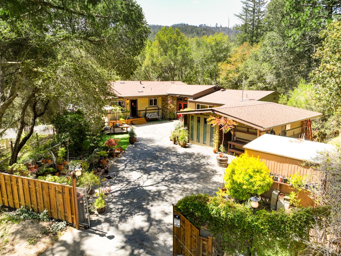 Sunny & private location just 1/2 mile to Downtown Boulder Creek! Single level home that has been thoughtfully upgraded w/ excellent craftsmanship & details. The home has a flexible floorplan - it can live as a 3 bed/3 bath home or a 2 bed/2 bath with separate 1 bed/1 bath unit with kitchen. Interior features include wood floors, built-in cabinetry, custom wood trim details, gas insert fireplace, sun tunnels, high ceilings, central forced air heating. Enjoy cooking & entertaining in your kitchen with breakfast bar, granite countertops, stainless steel appliances, gas stove and delightful walk-in pantry with windows. So many places to sit and enjoy the outdoors and garden. The workshop in the garage has room for your hobbies & toys and has a laundry room with sink. Under the home you will find an extra large storage room with workbench as well. Great neighborhood within strolling distance to Boulder Creek town. Lots of parking for all of your vehicles as well. Welcome home!