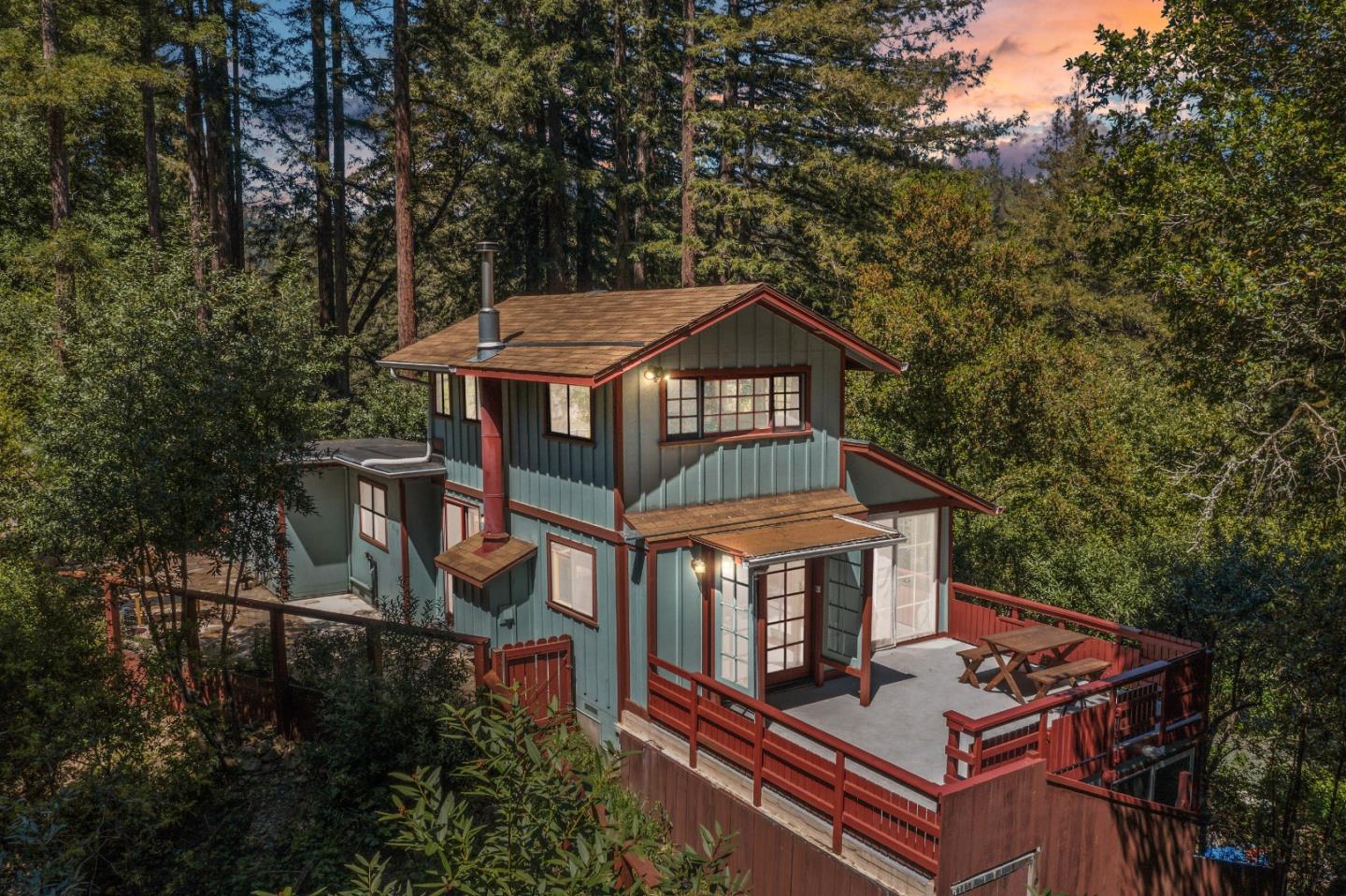 Experience the enchanting charm of "Pook's Hill," a historic 1921 home nestled in the heart of the redwoods. This meticulously preserved gem boasts bamboo floors, hickory kitchen furnishings, and exposed beams, maintaining its character while embracing modern amenities. Named after a character in a Rudyard Kipling book, the home has a rich history, including as a summer retreat for women of San Francisco. The versatile layout offers spaces for offices, workshops, and guests. Storage is available in the shed and basement, while a basement suite provides guest privacy. Surrounded by lush oak, madrone, redwood, and bay trees, this haven offers privacy and the feeling of living in a treehouse. Cozy winter nights by the wood-burning stove and summer weekends tending to fruit trees and vegetable and herb gardens ensure all-season enjoyment. Located in the vibrant Ben Lomond community for easy access to restaurants, shops, and the countless hiking trails of nearby state parks.
