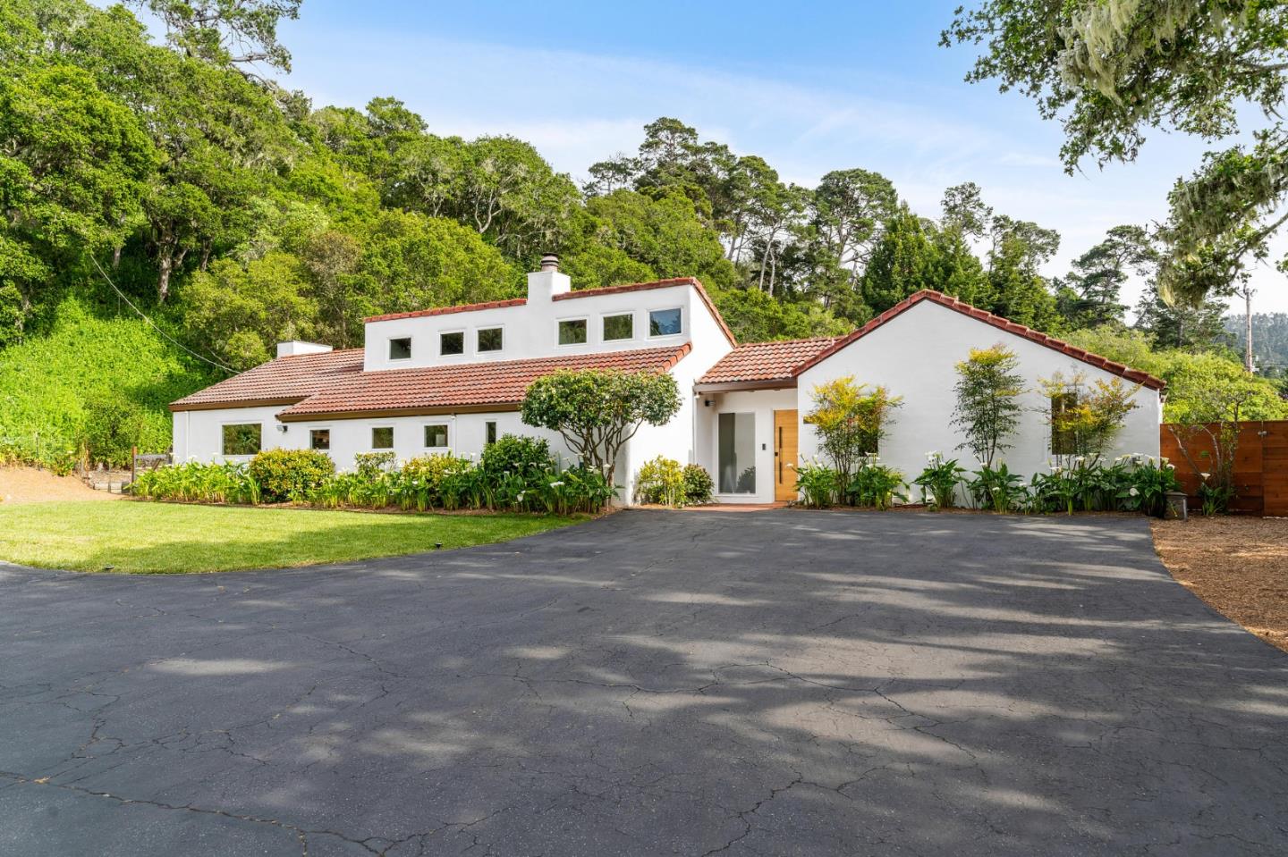 This single-level Mediterranean home, situated on 1+ acre brings a sense of calm and tranquility. Originally designed by local architect Donald Wald, the spacious flow and recent artful renovations harmonize minimalist functional design and quality craftsmanship. The renovated kitchen features custom designed oak cabinetry, dark soapstone countertops and a thoughtfully designed pantry. The three oversized bedrooms have windows that take in daylight and allow for peering out into the natural oak setting. Doors from throughout the home open to the private courtyard and expansive grounds. Sustainable features include the rooftop solar (2020) and an irrigation well that services the mature orchard with citrus, apples and pears. Nestled in the Aguajito sunbelt between Old Del Monte Golf Course & Jacks Peak, this convenient location is close to downtown, the Monterey Bay recreation trail, and nearby amenities for shopping, dining, and entertainment that the Monterey Peninsula has to offer.