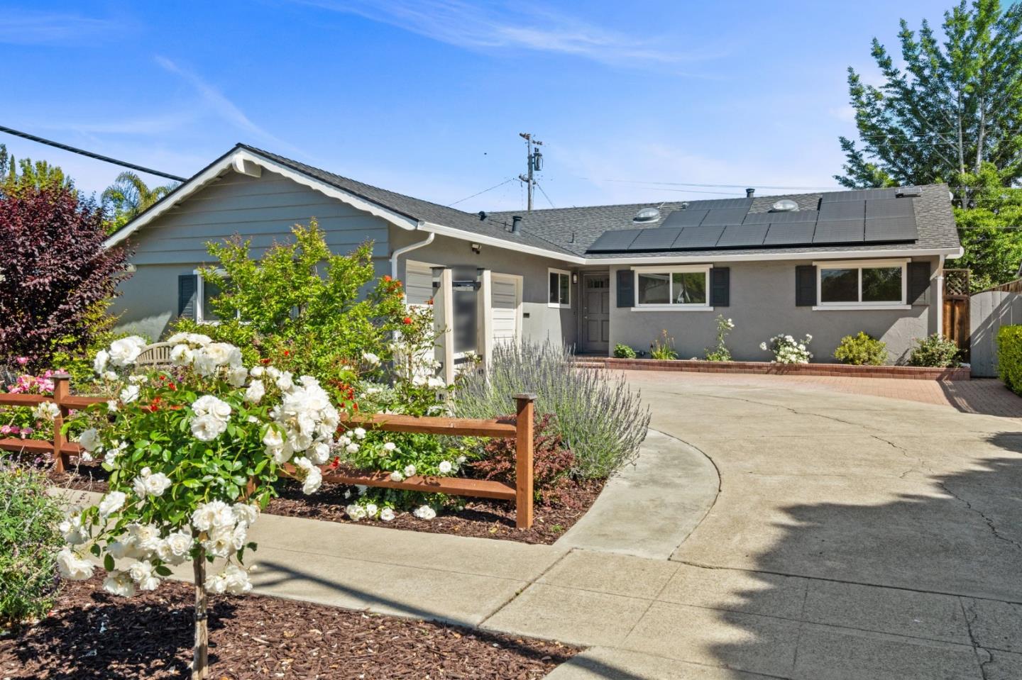 Boasting a prime location, the home presents enchanting curb appeal with stunning English-style garden, single-level floor plan with refinished hardwood floors, freshly painted interiors. Open floor plan connects living room with fireplace, dining room and kitchen areas. Chef's dream kitchen with custom cabinetry, granite counters and stainless steel appliances. Separate wing for bedrooms, remodeled primary bath with quartz counter, dual sink vanity, and glass-enclosed shower. Eco-friendly features: solar power, solar tubes, synthetic lawn. Large rear yard with paver stone patio offers ample space for outdoor entertaining & dining. Attached 2-car garage with EV charger, dual paned windows, central A/C and newer water heater. Close proximity to playground & tennis courts, community center, library, swim center & Los Gatos Creek Trail. Shops, restaurants, Pruneyard, Downtown Campbell, Downtown Willow Glen, Santana Row close by. EZ access to commuter routes; SJ Airport only 6mi away.