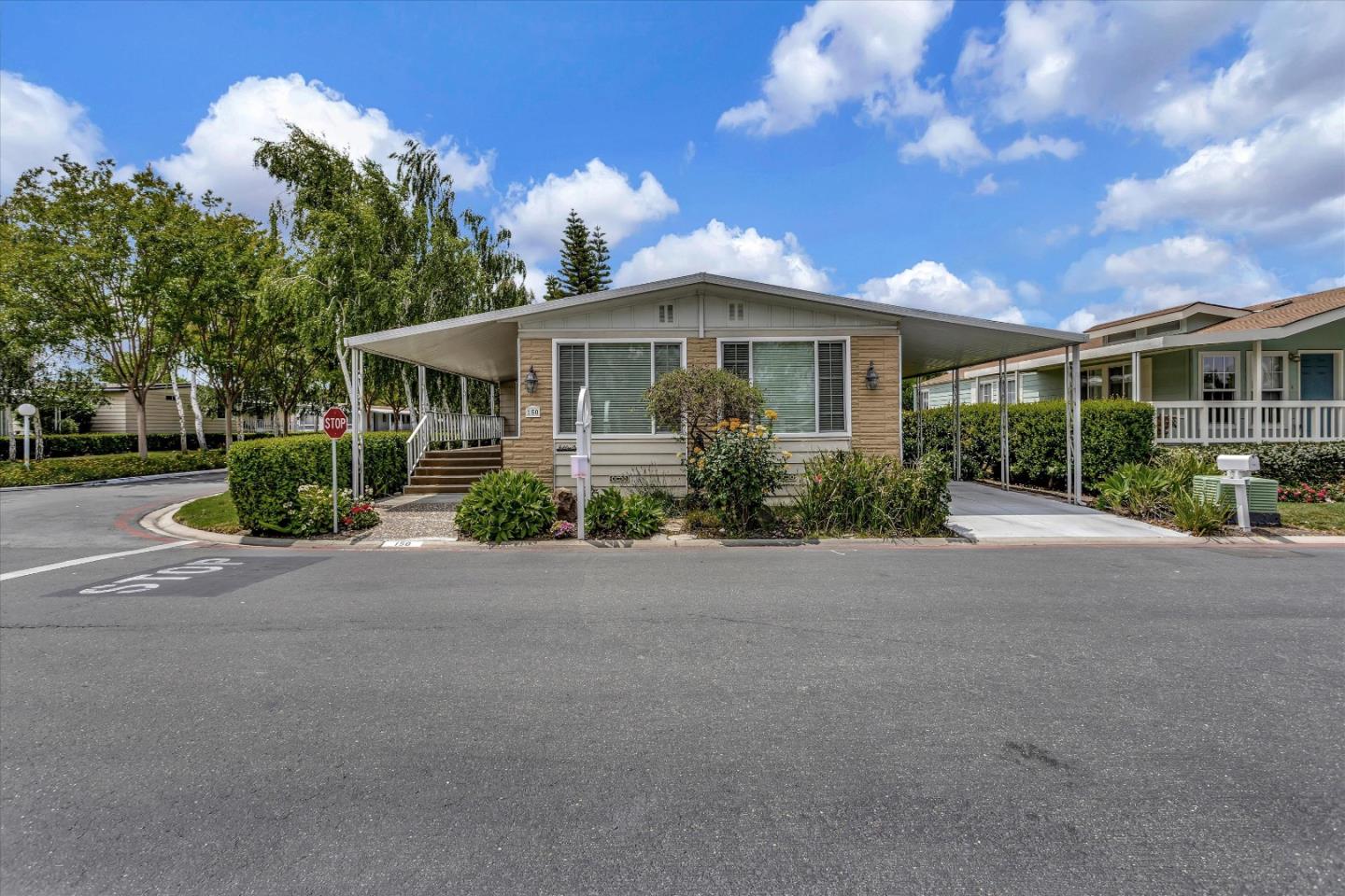 Situated in a highly sought-after 55+ senior community, this charming 2 bedroom, 2 bathroom home aims to please. The inviting porch is a reminder of simpler times, and beckons one to imagine neighborly chats and sips of wine or coffee with friends and family. Once inside, the home boasts carpet floors throughout, separate living and family room, ample storage, and abundant natural light. The kitchen is bright with well-maintained appliances, island with an extra sink, and lots of cabinets. The primary bedroom is generously oversized with lots of closet space. Soak in the luxurious soaking bathtub in the primary bath that also features a separate shower and double sinks. The second bedroom has a shared bathroom that connects to the laundry room. You will not find a community that has a better balance of beauty, safety, stability, peacefulness, affordability, community atmosphere, and pride of ownership! Central location, close to Highway 101, 237 & 85. Near major high-tech companies, grocery stores, Levi's Stadium & VTA light rail. Space rent to new owners: $1,616/mo.