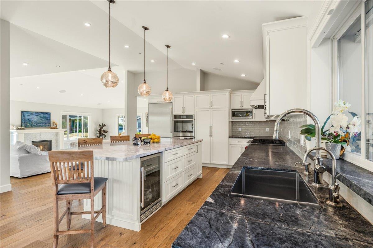 This Seascape beauty was completely renovated in 2021. Situated on a tranquil cul-de-sac, it is moments from beaches, shops, and dining. With 5BR, 4.5BA, + office, this spacious home spans 3,805 square feet. Enjoy sunsets and ocean peeks from the upper level which has 3BR+office & 2.5BA. The lower level has an additional 2BR, 2BA, bonus space, laundry room, and an oversized garage. The homes centerpiece is the kitchen, showcasing vaulted ceilings, a magnificent 9-foot marble island with pendant lighting and seating for six, a Wolf cooktop, soapstone counters, wine fridge, double ovens, under-cabinet lighting, and custom cabinetry. The kitchen patio is ideal for outdoor entertaining and leads to the private backyard oasis with gas fire pit, garden, and fruit trees. From the wide plank oak floors and recessed LED lighting to the built-in speakers and natural stone counters throughout, this home exudes casual elegance. Experience the ease of coastal living in this exceptional home.