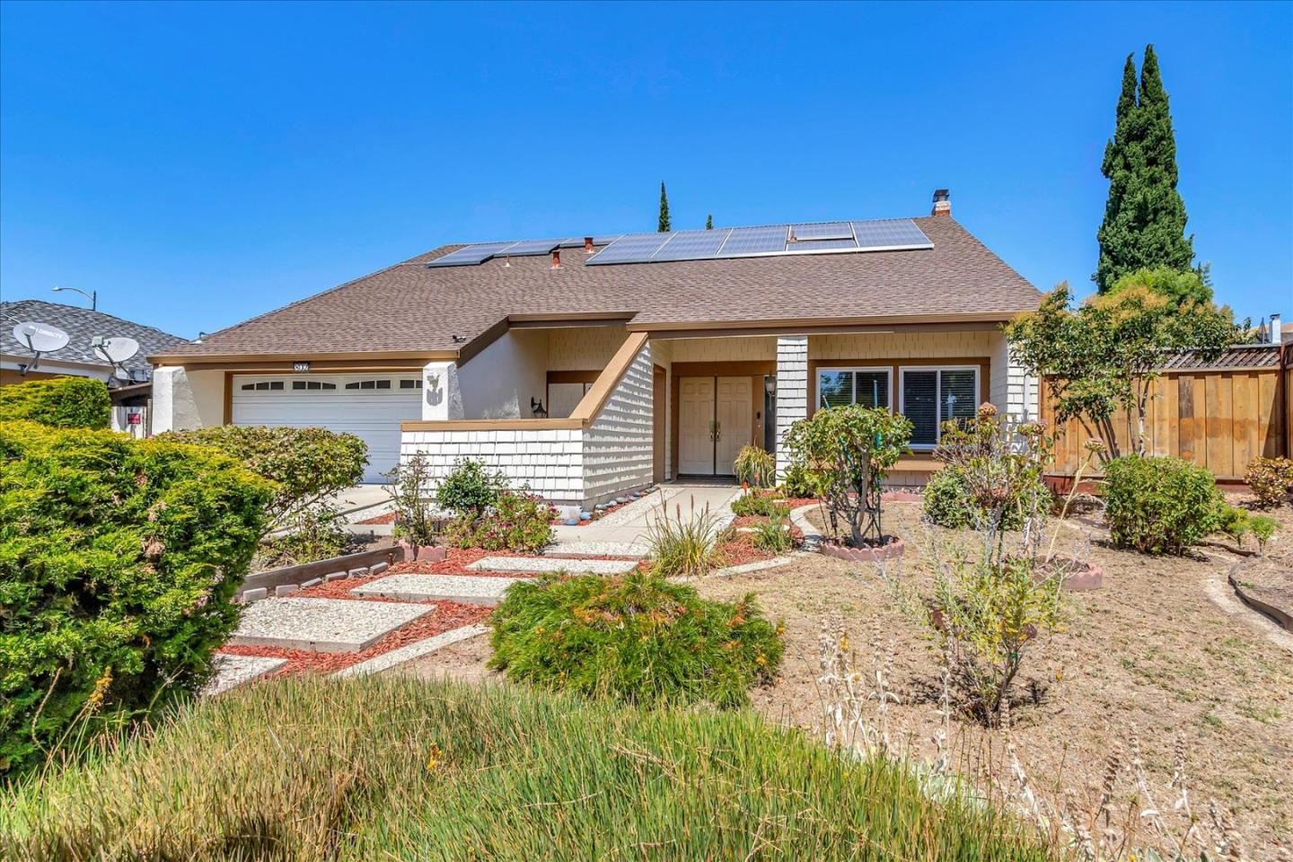 This wonderful home has had only 2 owners and is in prime shape. Step into the separate entryway and be greeted by soaring cathedral ceilings. There are 5 bedrooms, 1 on the main level, 3 full baths. The primary suite is spacious with cathedral ceilings and a primary bath remodeled using Travertine tile. Downstairs hall bath has marble vanity and floors. The kitchen looks out into the family room, the formal dining room has French doors opening into the kitchen and the formal living room is a great place to entertain. The laundry area is conveniently located inside. Windows replaced within the last 10 years, two stage furnace and a/c replaced in 2021, water heater new in 2020. Newer hardwood floors. Enjoy the serene privacy of the rear yard listening as the waterfall drops into the beautiful koi pond. Enjoy the bounty of the peach, orange trees and the raspberry, blackberry bushes. Full 2 car garage. Close to bus lines, parks, shopping, restaurants. Solar panels leased.