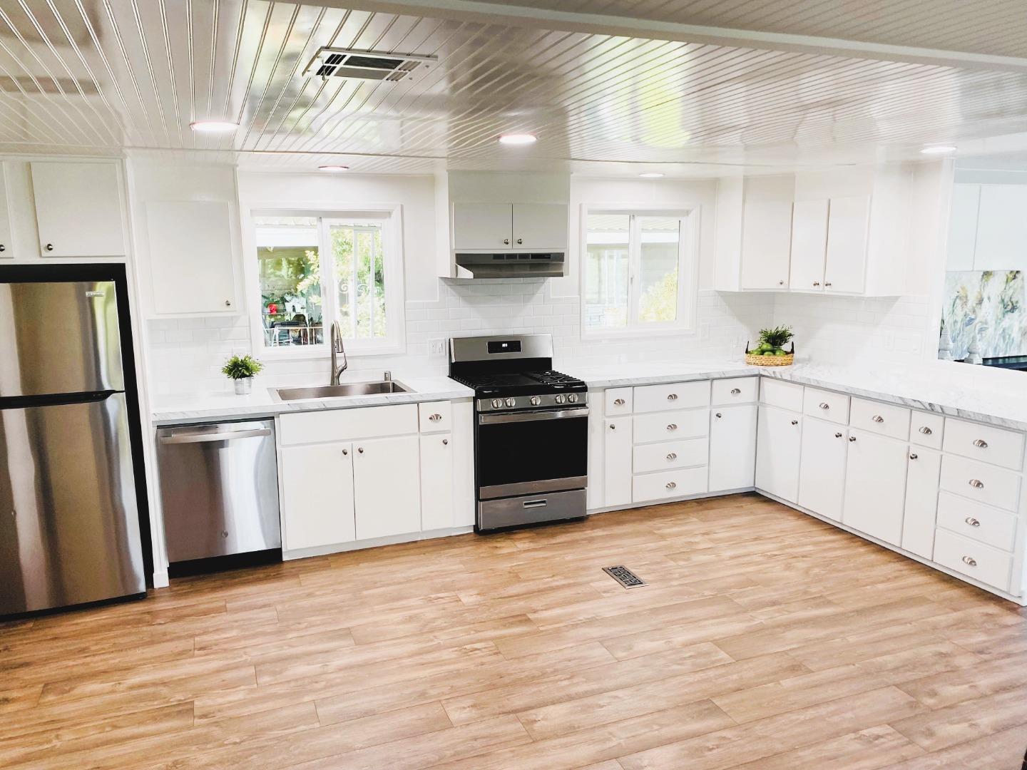 Extensive Remodel. No Property Taxes. All new, huge, gourmet white kitchen new cabinetry, new stainless appliances. Double pane windows. New light fixtures and recessed lighting. Two bedrooms and two full bathrooms. New bathroom vanities and toilets. Open floorplan. Spacious Living Room. New flooring throughout. Freshly painted inside and outside. Located in the highly desirable Mission Bay Mobile Home Community. Close to the Club House and pool. Lots of guest parking across the street. Space rent $1256/month. One buyer must be at least 55 years of age.