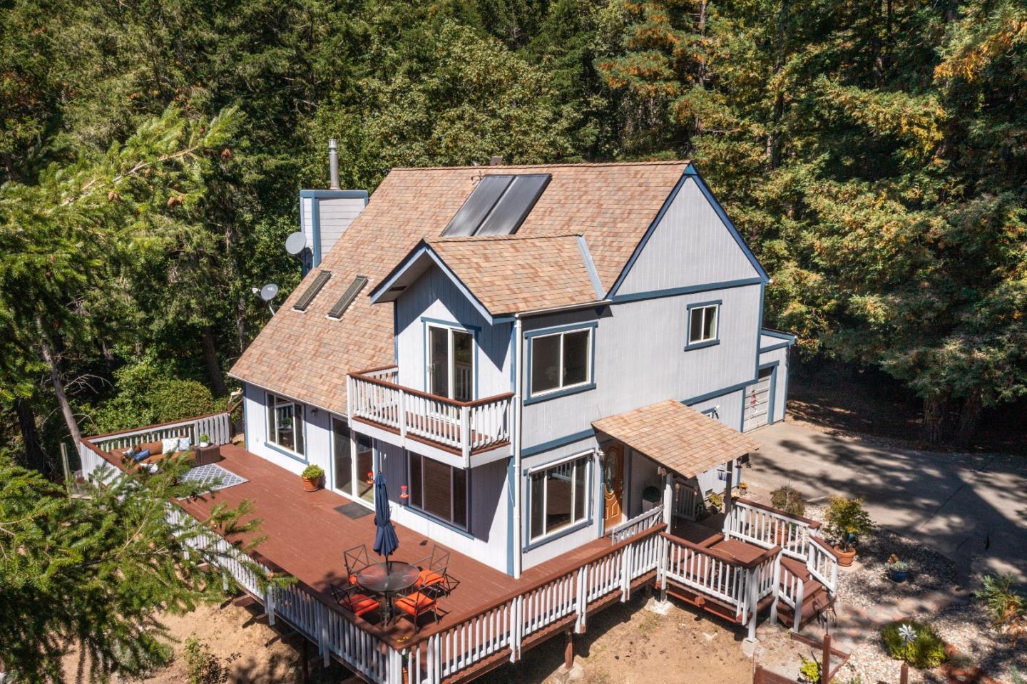 Storybook setting in the redwoods on approx 8 acres. Enter via a long, private driveway, winding past majestic sequoias, to this secluded home site with inviting covered front porch, drought resistant landscaping, and spacious sunny deck. Charming interior with remodeled kitchen open to great room with vaulted wood ceiling, spacious dining/living areas with new LVP flooring. Propane free standing stove. One bed and full bath on ground floor, 2nd floor expanded master suite with sunroom and remodeled bathroom with oversize stall shower. 2nd bedroom + hall bath, loft (office/play room) overlooks the great room below. New Light fixtures and flooring throughout most of the home. Sunny deck, roof was evaluated for solar, has good sun exposure. Attached 2 car oversized garage. Property has been lovingly maintained, beautiful. Excellent private water system (riparian rights) as well as option to hook up to Summit West water. Loma Prieta elementary district, Los Gatos High.
