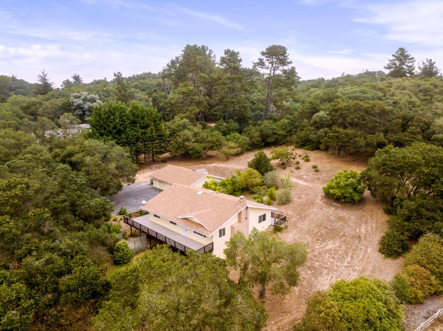 Private, peaceful home in gated Tuckahoe Terrace community! Well cared for 3 bed 2 bath single story home on 3+ acres. Wrap around deck with views of mature trees, fruit trees, and pasture. Spacious home features updated kitchen with granite countertops, breakfast bar and newer stainless steel appliances. Kitchen/dining area are open to large family room with fireplace. Separate mudroom/laundry room with newer washer/dryer. Large en-suite primary bedroom. Two good sized bedrooms, shared hall bathroom, built-in linen cabinet in hall. Huge storage room below the house. Separate oversized 2 car garage with built-in storage. Approx 450 sqft unit attached to garage with living room, family room, kitchen, full bath. Tranquil property features 3.17 +/- sprawling acres with many fruit trees, mature oaks and more. Gated driveway.