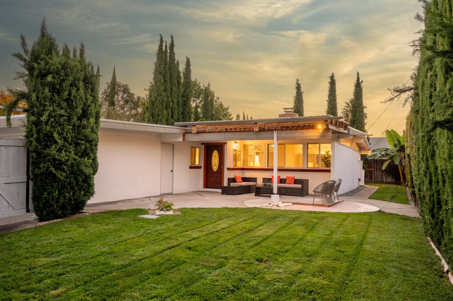 PRIVATE MIDTOWN HOME FEATURES MID-CENTURY STYLE | Mid-Century Modern features and immersive privacy define this highly convenient Midtown home. Luxuriant lawns hedged for privacy wrap around the residence, creating a spacious and inviting courtyard-style entry. Vaulted beamed ceilings span light-filled interiors where the breezy layout allows easy indoor-outdoor flow. Amenities include open gatherings areas with a fireplace, clerestory windows, indoor laundry, updated luxury floors, sky-lit baths, and the stylish refinished kitchen. The two-car garage includes EV wiring and plenty of storage. Outdoors, enjoy mature citrus trees, leisure patios, and planters with drip irrigation for an edible garden. Stroll to Seale Park, Midtown Shopping Center, and Palo Alto YMCA. Near freeways, tech campuses, and sought-after schools like Palo Verde Elementary, JLS Middle, and Palo Alto High (buyer to verify).