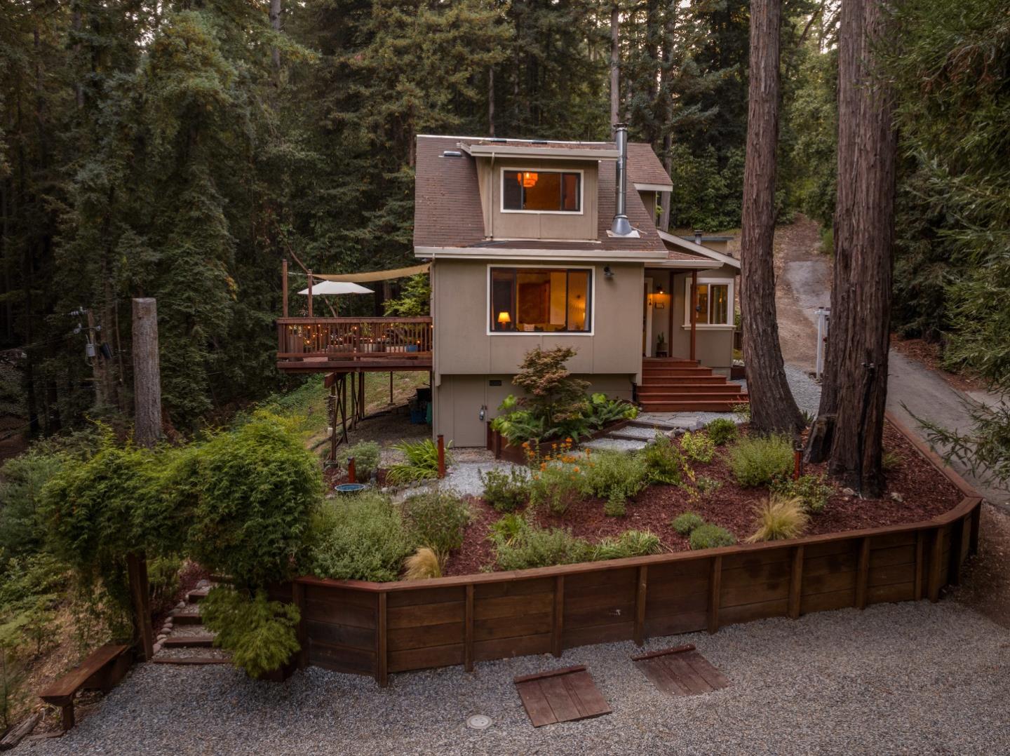 Discover the magic and serenity awaiting at the end of a private road with this home, conveniently situated near Hwy 9, Ben Lomond, Felton, and just 18 minutes from Santa Cruz. The outdoors beckons with a vibrant hummingbird and butterfly garden, an herb garden, a fairy ring deck, and an area for a firepit or RV parking. Inside, the home harmonizes with nature, featuring large windows that bring the outdoors in and interiors adorned with Douglas Fir flooring and custom-crafted doors. The open-concept kitchen boasts cherry cabinets, granite countertops, an induction cooktop, and high-efficiency appliances. The living space extends to a wrap-around Redwood deck. Accommodations include two upstairs bedrooms, one with a loft, and a versatile downstairs room. Luxurious baths grace each level, with the upper one featuring radiant heat flooring. Practical amenities include upstairs laundry, ample parking space for 6 vehicles, a Level 2 EV charger, and a residential battery backup.