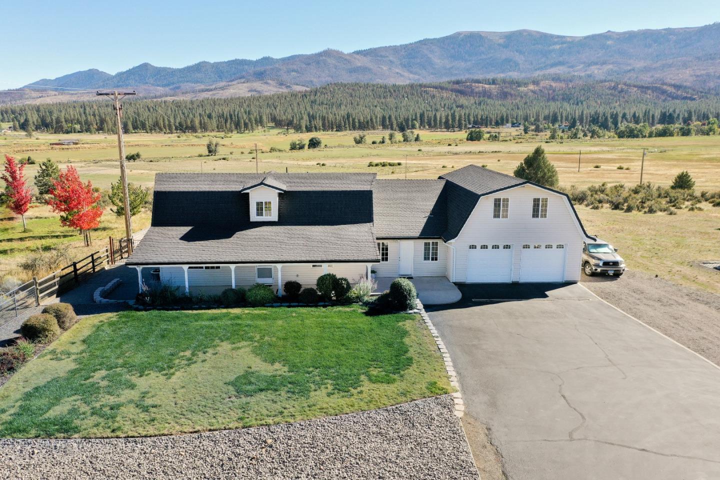 Unbelievable views of Diamond Mountain and Thompson Peak from the decks and patio welcome you home each day. Always a shady or sunny respite available. Central heat and AC keep it comfortable inside or out no matter what the season. Great garden area has already been established, sheltered dog kennel is in place and still lots of room on the property to develop horse facilities. Fantastic 2032 square feet highly upgraded home with a partially finished loft above the extra 900 square foot two car garage is on a 5.7 acre view parcel. The primary bedroom and bath on the first floor also have a Jotul gas log stove to keep it cozy. An adjacent office area has built in desks and separate entrance. There is also a roomy half bath on the first floor. The two upstairs bedrooms have lots of storage space and share a full bath. The garage includes a workshop area and provides access to the 2nd floor partially finished, insulated room that might accommodate another bathroom.