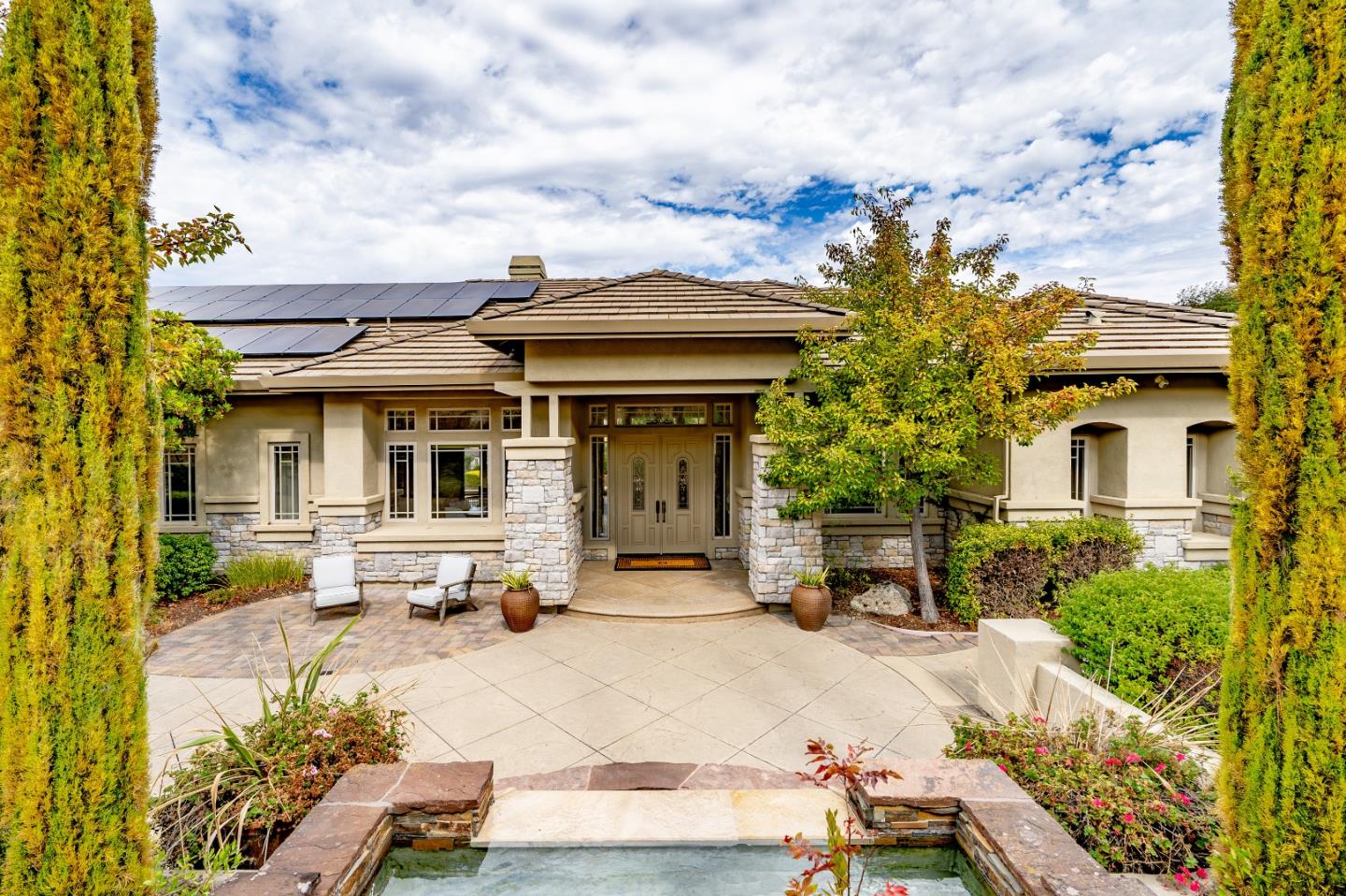 A private, spacious estate nestled in the exclusive Crowne Point neighborhood, this stunning home exudes privacy & luxury while overlooking the twinkling lights of the Salinas Valley. The grand entrance welcomes you into the foyer leading into the spacious open living area featuring 14' ceilings, Spanish white oak hardwood flooring & double-sided fireplace, leading from the formal living into the kitchen. Chefs kitchen features a large island, walk-in pantry, Wolf double ovens & cooktop. Large private office perfect for working from home. The primary bedroom & bath is a complete oasis including a cozy reading nook with fireplace & French doors leading to the outside patio. Enjoy serenity with breathtaking views of the hills from every corner of the property with additional acres to obtain complete privacy. An outdoor kitchen with built in BBQ, a 3-car garage, owned solar panels, EV charging, security system and soft water are all on site. A rare gem, indeed.