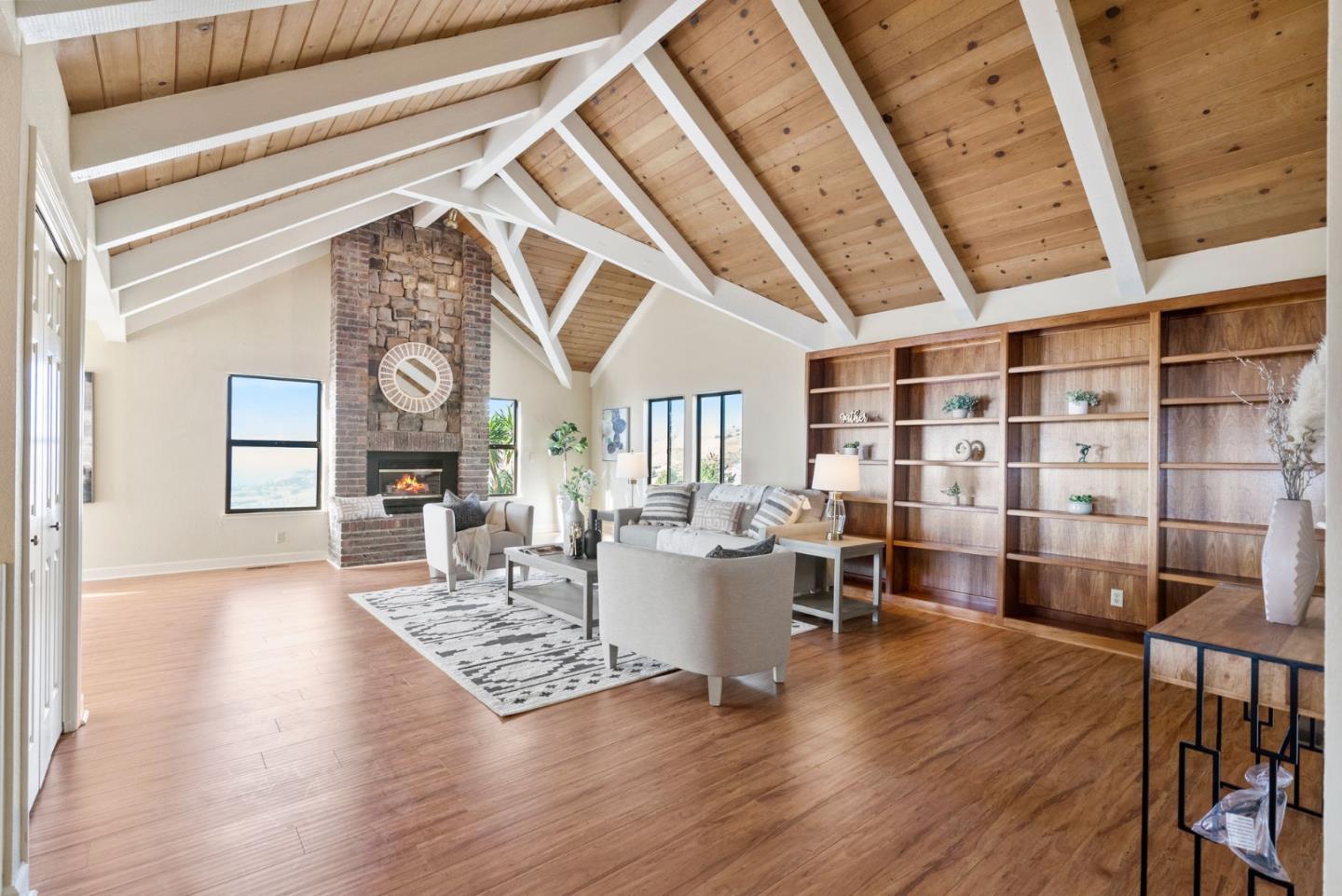 This is it!. Magnificent home is nestled in a 3.98-acre lot within the Three Springs Ranch Gated Community in the San Jose Foothills. The two-story home is flooded with natural light, featuring a grand entrance and an expansive living room with cathedral ceilings, a rock fireplace, and a wet bar. The adjacent formal dining room offers indoor-outdoor entertainment with a built-in hutch and a balcony. The updated kitchen showcases warm-toned cabinets, granite countertops, top-tier appliances,and tiled flooring. The family room connects to the kitchen, providing access to a spacious deck. The main bedroom offers valley views,bathroom includes dual sinks, a sunken shower, and cedar-lined closets. All 4 bedrooms are spacious, including the fifth bedroom and full bathroom. The property includes an office. and entertainment room, a 3-car garage with storage and a workshop. A fruit tree orchard enhances the landscape, while unobstructed Bay Area views make this location truly remarkable.