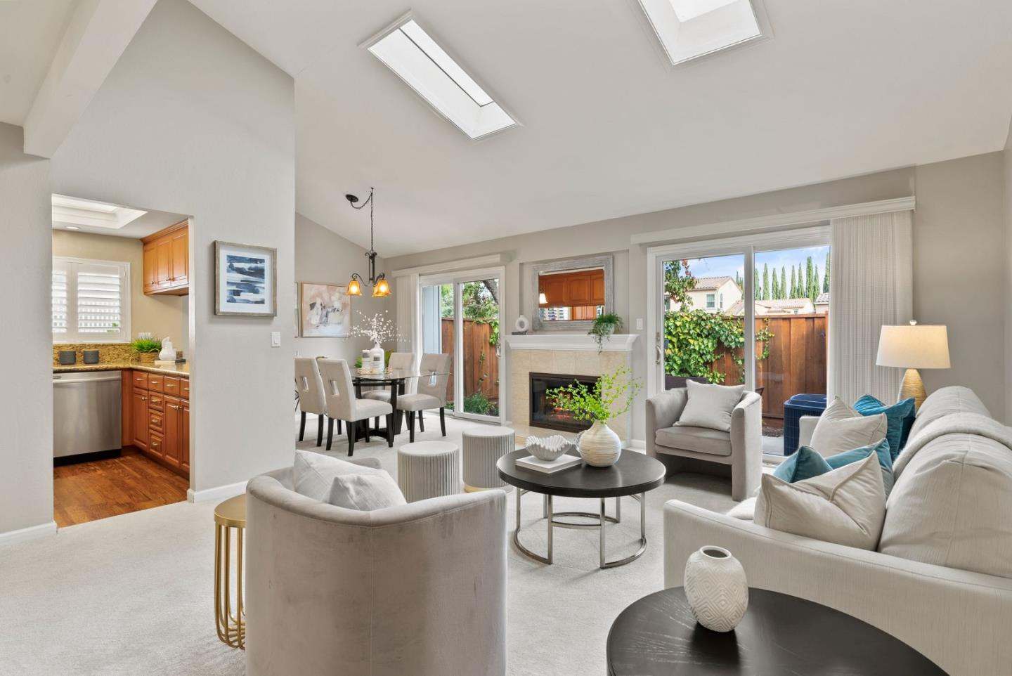 Relish in comfort & convenience in the desirable city of Cupertino. Tucked away in a manicured community, youll find this classic townhome with a bright interior, where plush carpeting expands across this split-level floor plan. Take in the sun-drenched living space as natural light floods through the towering sloped ceilings skylights & dual glass sliders that flow out to a private back patioenjoy after-dinner drinks in the evening air or cozy up by the elegant fireplace inside. The well-equipped kitchen offers gleaming planked flooring, stone countertops, & stainless steel appliances that further elevate your culinary experience. Stairs lead you up to the incredible primary with a private balcony, tons of closet space, & pristine ensuite. A full hall bath accompanies a lovely guest bedroom with built-in shelving & completes this darling abode. Explore your surroundings; you're minutes from plentiful shopping centers, golf courses, Apple, & all that Cupertino has to offer.