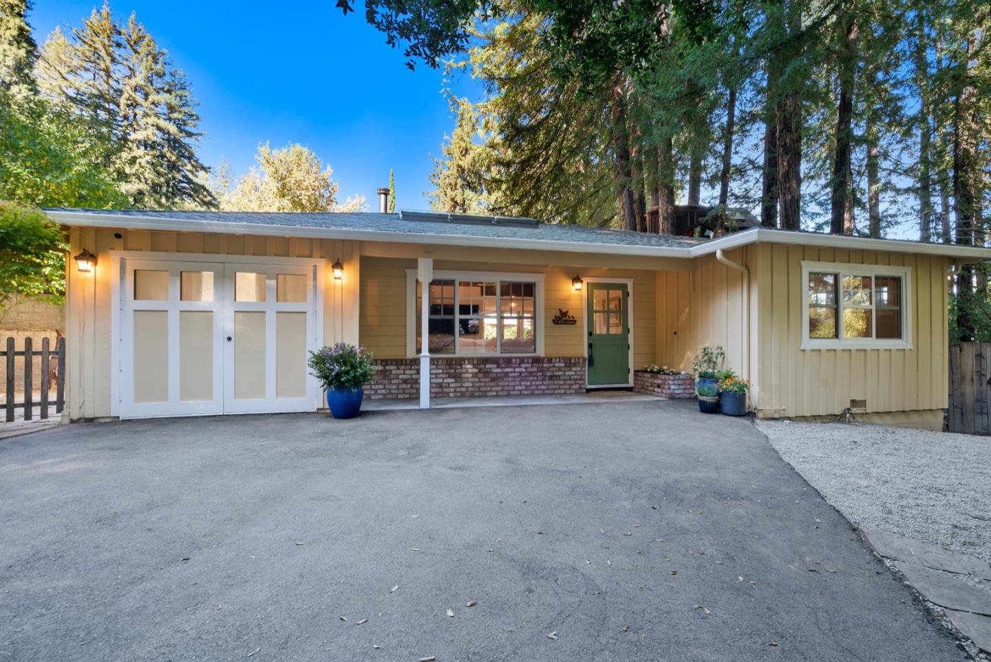 CHARMING recently renovated home nestled in the redwoods of Ben Lomond with plenty of sun! Walk into the living room featuring gorgeous Somerset hardwood flooring with redwood ceiling and beams and a custom rock hearth with cozy wood burning stove. Kitchen boasts of new Cafe appliances, navy cabinetry, quartz countertop, plaster hood, and California Walnut live edge open shelving. Dining area has a built-in banquet seating. This home lives bigger than the square footage suggests. Bonus room in finished garage. French doors open to back patio with raised garden beds, a darling kids' play house, and the most AMAZING custom tree house! Various detached structures including an office space, workshop, and chicken coop! Photos coming soon! Sunday 11/5 Open House has been CANCELLED!
