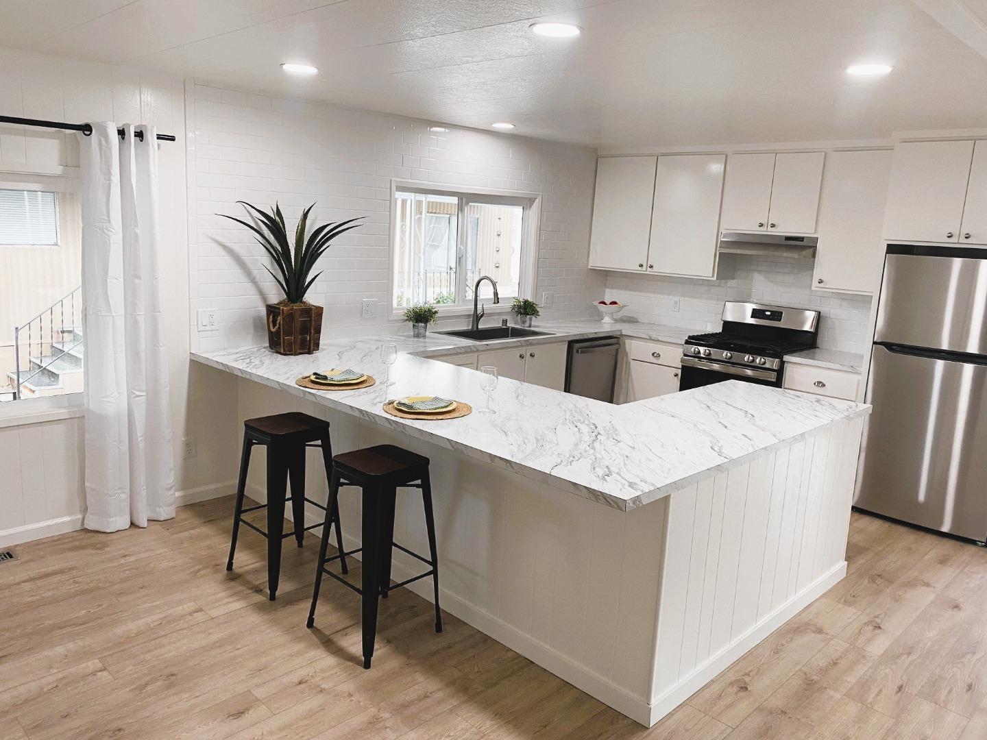FULLY REMODELED, LOW SPACE RENT & NO PROPERTY TAXES! Spacious, open floor plan. Two bedrooms, two full bathrooms. 1536 square feet. Double pane windows. French doors. Stunning new kitchen with new stainless appliances, beautiful white cabinetry, lots of counter space, and a long breakfast bar for plenty of seating. Recessed lighting. New flooring throughout. Spacious bedrooms. Two full beautifully remodeled bathrooms with showers, tub. Separate laundry room. Freshly painted inside and outside. Located in the highly desirable Town and Country Mobile Village. Closely located to lot of great shopping, dining and Kaiser Hospital. Buyer must be 55 years or older to qualify for the park. Space rent is $1051.