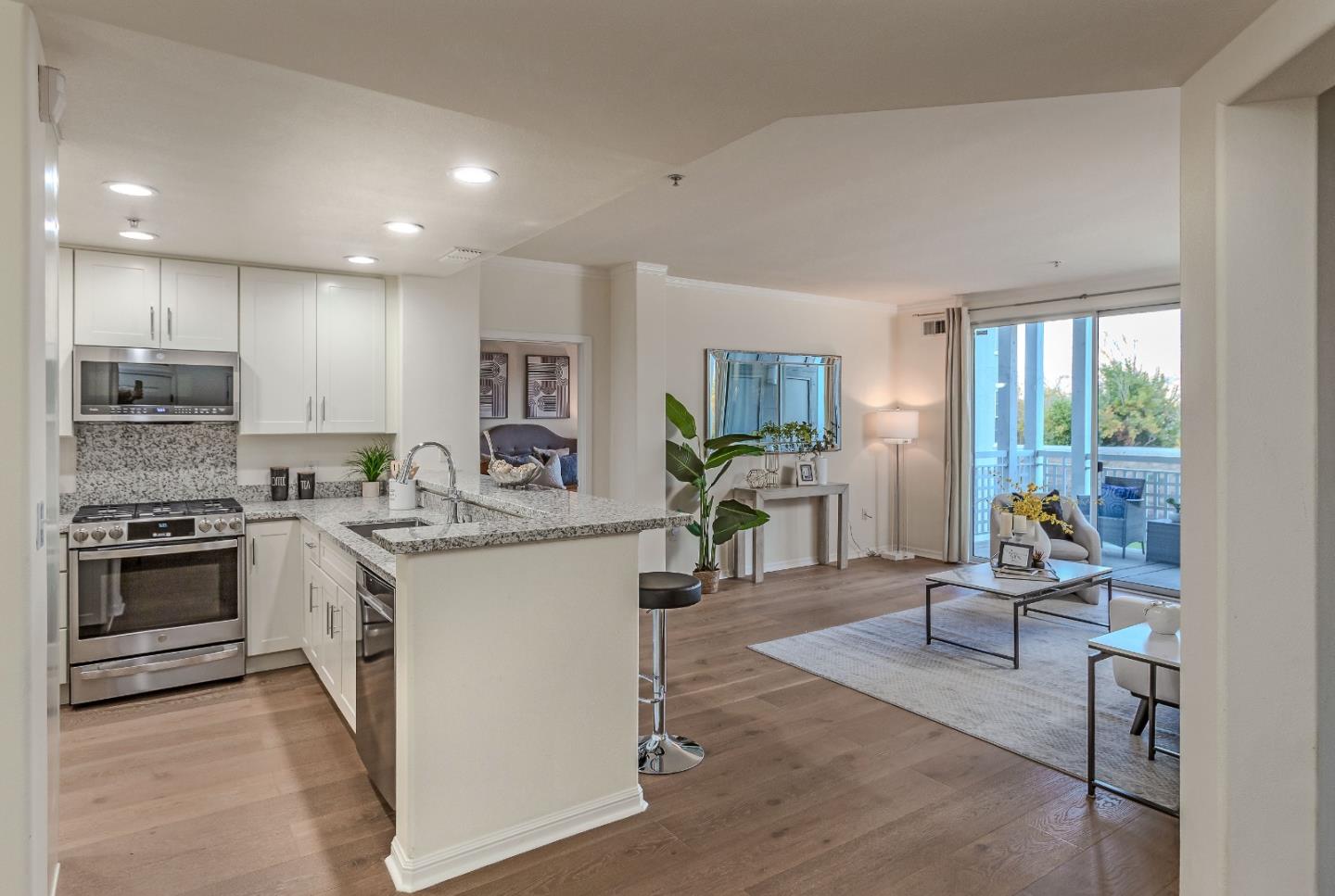 Located in the coveted Miraval community, this second floor corner unit is situated at the rear of the community offering views of the eastern foothills. The recently remodeled kitchen is equipped with custom soft-close cabinetry, granite countertops with breakfast bar, stainless steel appliances, recessed lighting, and new flooring which extends into the living room. Both bedrooms and bathrooms are spacious, with the primary offering dual closets and separated shower and tub. Dual pane windows, forced heating and air conditioning, in-unit laundry room, and covered patio are additional comforts ready for you to enjoy. Miraval offers multiple resort-like amenities such as a lap pool, spa, BBQ area, gym, and clubhouse. There are two covered spaces in the secure underground parking. Nearby to numerous tech companies, Rivermark Village, entertainment venues, parks, and trails, this home also allows easy access to multiple commute routes. Low Santa Clara utilities!