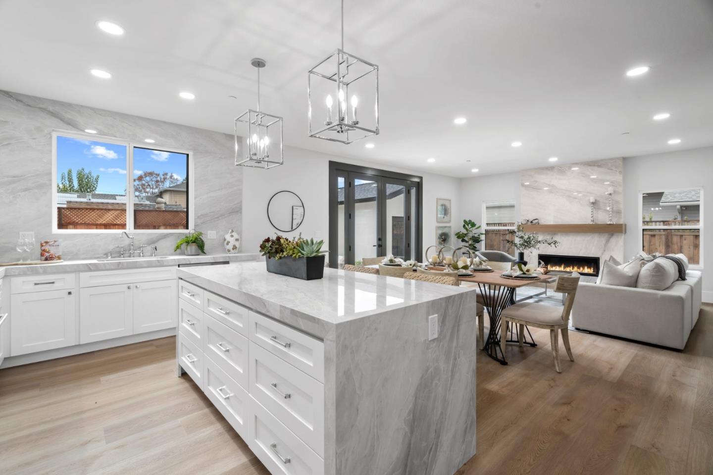 1030 Iris offers an impeccably remodeled 3BD/3BA (1,715 SqFt.) home plus a detached 1BD/1BA (525 SqFt.) guest house complete with a kitchen, living room, and washer/dryer hookups, perfect for extended family, guests or rental income. Step inside the main home offering an expansive great room, where the chef's kitchen features porcelain countertops, all new stainless steel appliances, custom cabinets, and large eat-in island with pendant lighting. The bright and spacious living room features a brand-new gas fireplace, and French doors leading out to the back patio w/a built-in firepit, the perfect setting for summer-time cookouts. The main home boasts two en-suite bedrooms, including the primary suite enjoying vaulted ceilings, walk-in closet, and a luxurious bathroom w/dual vanities, eye-catching gold designer finishes, and luxurious walk-in shower w/wall-mount and rain shower heads. The detached guest house also enjoys a full-suite of designer updates, plus vaulted ceilings in both the living room and bedroom and brand new AC unit, providing suite-like accommodations for all of your overnight guests. Situated in a central Redwood City location, about a mile from downtown, a couple blocks down from Red Morton Park, and a short distance to the Roosevelt Shopping Center.