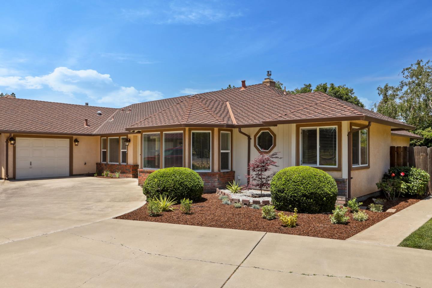 Nestled within a coveted neighborhood in the heart of Manteca, this exceptional semi-custom single-story home sits on a sprawling corner lot and seamlessly blends comfort with style. Enjoy the prime location, opposite the Manteca golf course. Manicured yards and covered RV parking complement the convenience and luxury offered. Inside, vaulted ceilings, a brick fireplace, and newly installed laminate wood flooring create an amazing feeling and look. The impressive kitchen, a culinary haven, boasts expansive countertops, ample cabinet space, and bar seating. The master suite features plush carpeting, outdoor patio access, and an ensuite bathroom. Three additional well-appointed bedrooms cater to family, guests, or flex space needs. Step outside to beautifully landscaped yards for tranquility and relaxation. This home also includes a three-car garage, extended driveway, water softener, and easy access to schools, parks, shopping, and freeways.