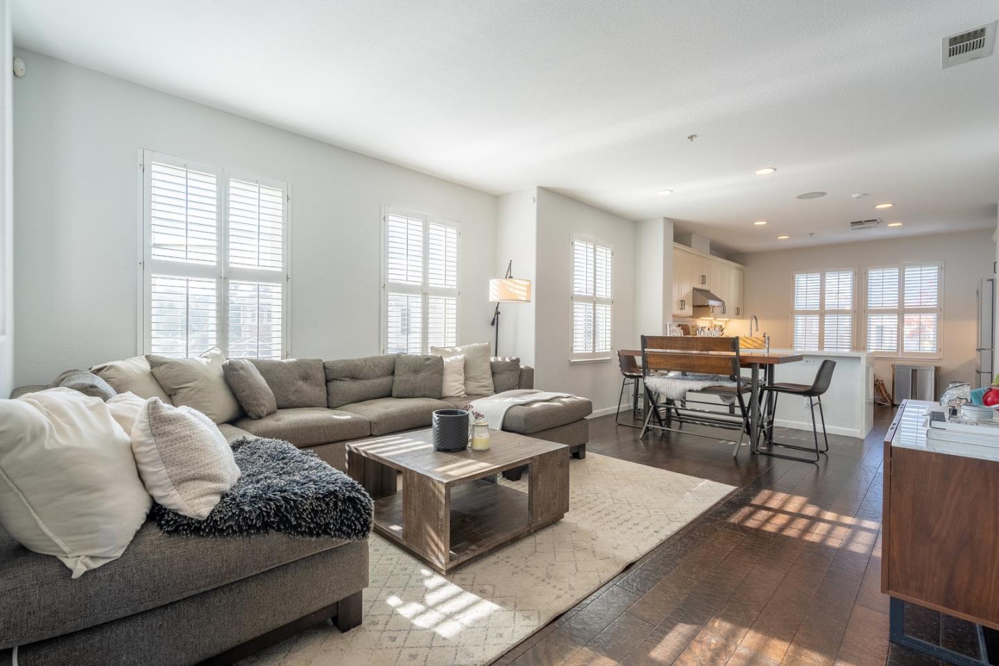 End Unit townhouse style beauty in the Willow Glen side of the Communications Hill. This former model home boasts with high-end upgrades and design. Circular staircase leads you to an open floorplan with gorgeous upgraded plank floors and high ceiling with ample of windows, upgraded wooden shutters and designer touches. Large kitchen with quartz countertops, white upgraded cabinets and desirable gas cooktop. Master bathroom and hallway bath both with upgraded designer tiles. Master with large walk-in closet. built-in stereo speaker system throughout, extra space for a desk/home office in the living room and large balcony for the BBQ or sipping on your morning coffee. Two car attached garage also has an extra space for a home gym. Secured storage and more...walk to the PLANT for a bite to eat or shop or to the park, the trails or outdoor sports park for a game of soccer. Low HOA and easy commute on 87 or 85.