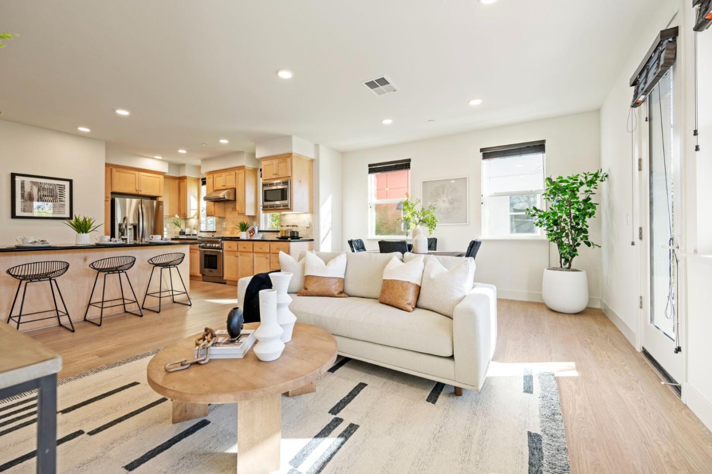 A rare opportunity! This exquisite home, built in 2018, features Two Primary Ensuites, the third bed & bath, beautiful new sturdy SPC floorings and high ceilings w/ luxurious finishes. South Facing Corner Unit brings in abundant natural light. Spacious living room flows into a beautiful dining area & a stunning kitchen - a generous sized island with bar stool seating, S/S Thermador appliances, lazy susan shelves and a walk-in pantry for maximum culinary storage. Step outside onto the Expansive Balcony to enjoy fresh air and relaxation. Owner's suite boasts a walk-in closet w/ a mirrored door, double sink vanity, water closet and a cozy balcony. Don't miss spacious second bedroom, storage cabinets, and an upstairs laundry with washer & dryer. A large ensuite downstairs is perfect for a guest room, home office, home gym or other flexible lifestyles. The 2 car Side-by-Side Garage provides storage space & added comfort. Enjoy walking to Great Mall, BART, VTA light rail, Trader Joe's, Farmer's Market, and Top-Rated Schools. This move-in ready home with a tankless water heater is ready for its new owner. It's a must see!