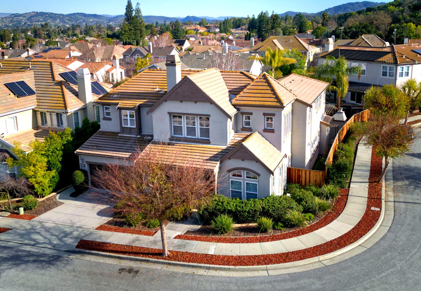 Prestigious Pierce Ranch by SummerHill Homes area of Almaden Valley with 4 Bedrooms plus Office and Loft including a primary suite on each level.. Extremely quiet location yet walking distance to Almaden's Quicksilver Park.. Very little car or foot traffic because the home is at the top of a loop. The only house on the street without a neighbor opposite. Unobstructed view of the winery's vines and the trees of Quicksilver. Kitchen has granite slab counters and backsplash, crown molding, recessed lighting, walk-in pantry with shelving and a dual bowl stainless sink. The island has a granite slab counter with an overhang that extends gracefully forming a space for casual dining. At one end, a vegetable sink stands as a testament to efficiency. Drawers and cabinets provide more storage while illuminated by two pendant lights. Stainless appliances, 6-burner gas cook top, and wine refrigerator. The backyard has a sprawling concrete patio covered by a pergola with a mature wisteria that is quite a spectacular purple color in the spring/early summer. Pizza oven. Birch trees, foliage and plenty of fruit trees, lemon, Meyer lemon, orange, very young fig plus a family apple tree that produces six varieties via grafting. Simonds Elementary, Castillero Middle, and Pioneer High School.
