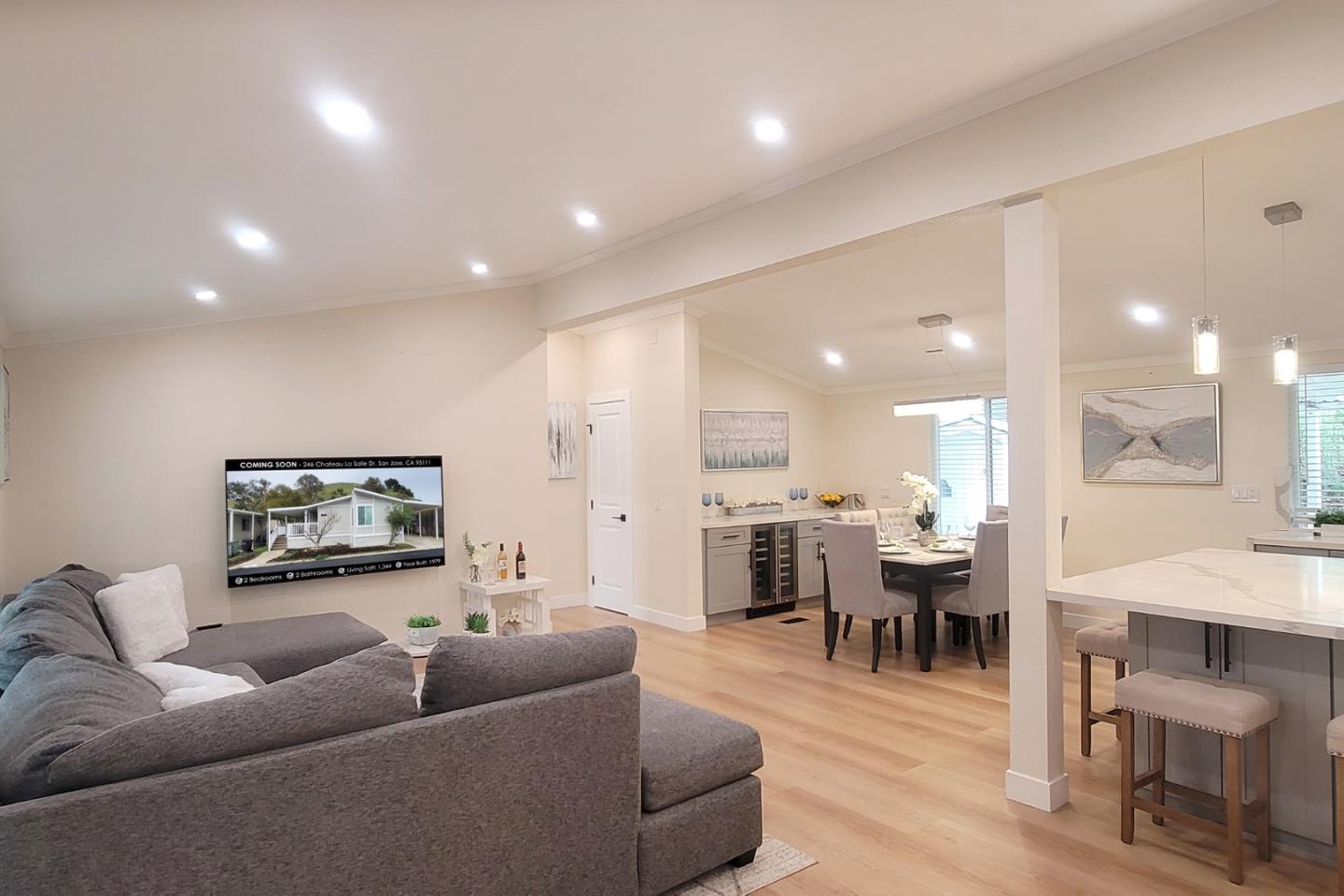 Discover the epitome of modern living in this completely remodeled 2-bedroom, 2-bathroom residence spanning 1344 sqft. Aesthetically pleasing with recessed lighting and luxurious vinyl flooring, the kitchen boasts ample counters, perfect for enjoying meals while witnessing culinary magic. Equipped with sleek stainless steel appliances, the home includes Samsung washer and dryers, adding convenience to your lifestyle. Two generously sized bedrooms provide comfort, complemented by additional storage in the shed. Chateau La Salle, a welcoming family-oriented community, transforms into a festive wonderland during Halloween and Christmas, creating a warm and vibrant atmosphere. Convenience is key, with proximity to Target, Home Depot, Walmart, and an array of dining options. Commuters will appreciate the easy access to the 87/101/680 freeways. Embrace the charm of this residence and make it your home where style, comfort, and community converge seamlessly.