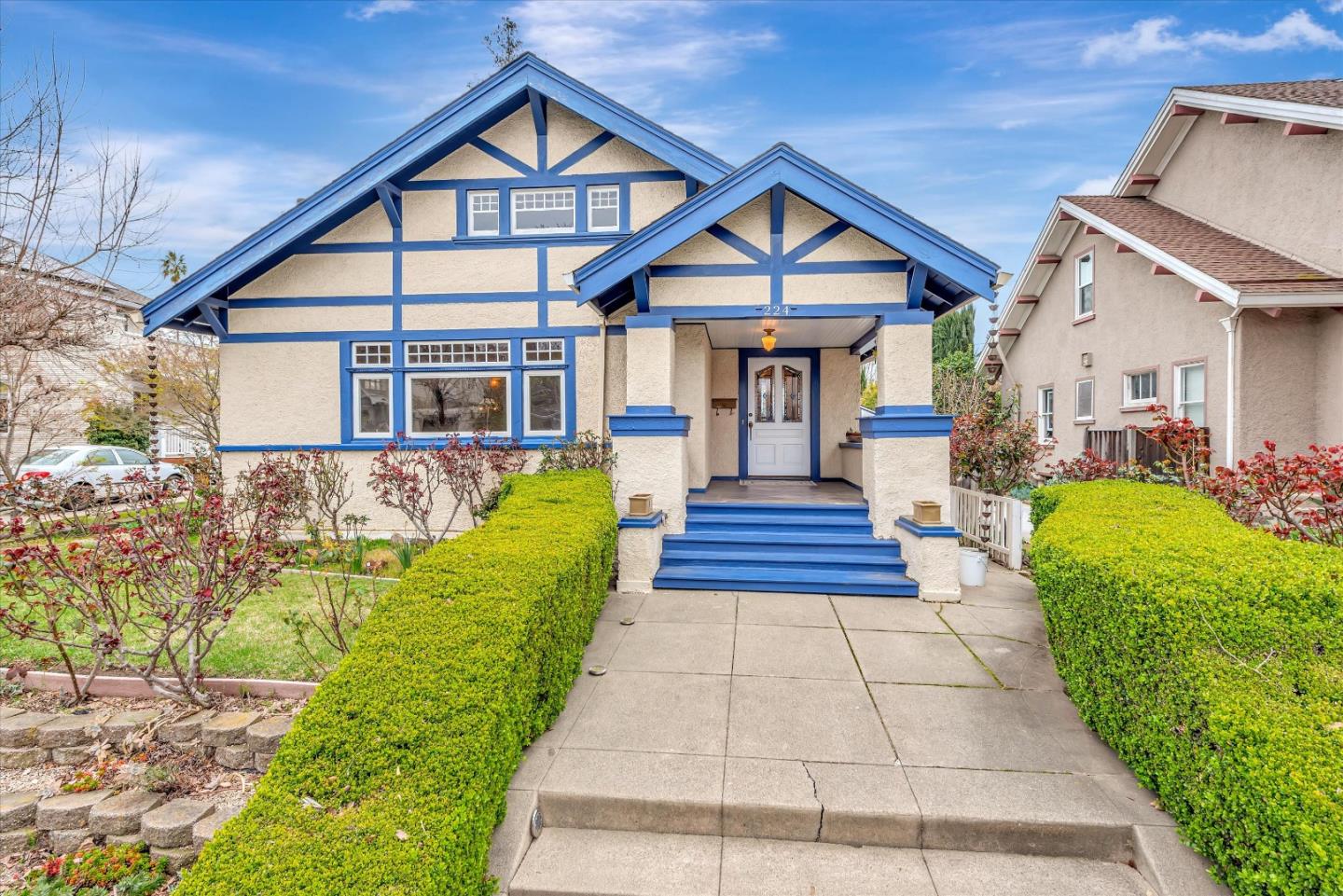 Classic Arts and Crafts home with lovingly preserved and updated features in the desirable Naglee Park Neighborhood. This home will impress all lovers of the Craftsman era! Formal entry leads into a spacious living room with brick fireplace flanked by built-in cabinets and beautiful leaded-glass doors. Impressive custom glass ceiling light with several matching wall scones to brighten the evening and large dual-pane windows allow for a cheerful view of the 42 rose bushes. A formal dining room is the centerpiece of the home with a built-in buffet with matching leaded glass doors. Both rooms have high ceilings with egg and dart trim and stunning custom murals, plus original wood molding. French doors open to the first bedroom currently used as a den. Updated kitchen with shaker cabinets, granite slab counter, glass tile backsplash, and SS appliances. Huge primary suite easily converted back to 2 bedrooms but functions as a wonderful retreat with 2 walk-in closets and French doors leading to a new deck surrounded by several fruit trees and mature landscaping on this oversized lot. Interior entrance to a huge basement with a finished bonus room. Totally updated primary bath with dual sinks and large shower stall. Plus, a new driveway, updated wiring, and water heater.