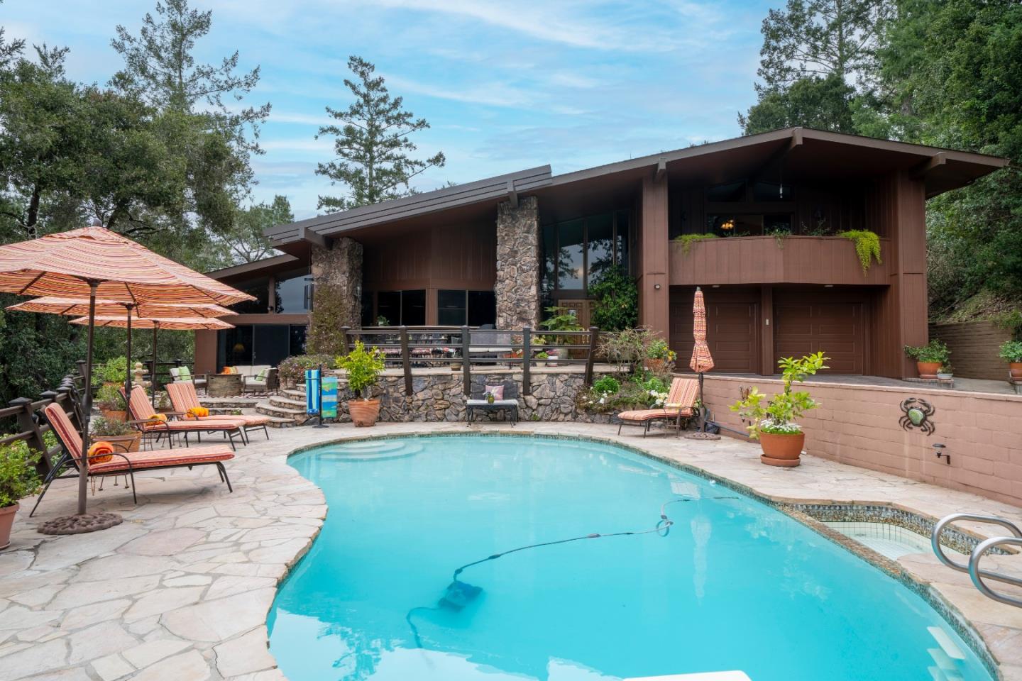 Mid Century Modern vibe with fantastic Resort style living on over an acre of private lush land. Built in pool with panoramic view of the Sunsets, Bay, New Brighton, Pleasure Point and forest. Very close in, get away from it all feel with large living spaces and bedrooms. Kitchen and baths have been nicely remodeled. A wall of windows showcases the water feature and surrounding garden providing a dramatic backdrop for the unique floating staircase up to the Main Bedroom Retreat with ocean view. Large eat in kitchen with wraparound Marble counters and ocean view. High ceilings abound in the ocean view Living Room and Dining Room. There is also a secondary Main bedroom suite and large bedroom on the main level. The outside gazebo is an ideal place for avian and wildlife viewing. A gated entrance and a short uphill brings you to this private sanctuary.