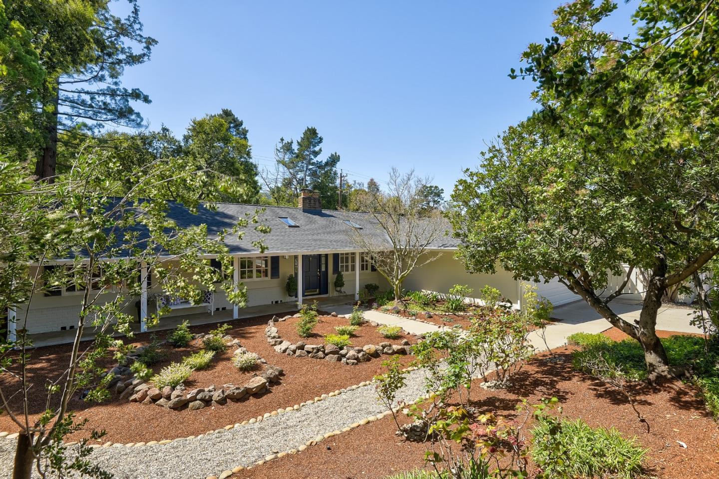 Located in the sought-after Highlands neighborhood, this classic ranch home has been thoughtfully updated and newly landscaped on a substantial one-third acre lot. The home begins with a deep front yard and inviting covered porch enhanced by window shutters and a matching front door all in a welcoming shade of blue. Inside, the one level home features 4 bedrooms, including the primary suite plus one that is ideal for a remote office, and 2 full baths. Refinished hardwood floors extend throughout and there is an open and flowing design for living, dining, and kitchen beneath a towering paneled and beamed cathedral ceiling. Highlights include a painted brick wall that shares a fireplace and indoor grill, a large casual dining area, plus French doors to the newly landscaped and spacious rear yard for entertaining, gardening, and play. Additional highlights include, new roof, new garage door, central AC and a large side yard with vehicle access for boat or RV storage. Adding the finishing touch is the homes access to Rancho San Antonio open space preserve and highly acclaimed Cupertino schools, including Montclaire Elementary just blocks away. Welcome home!