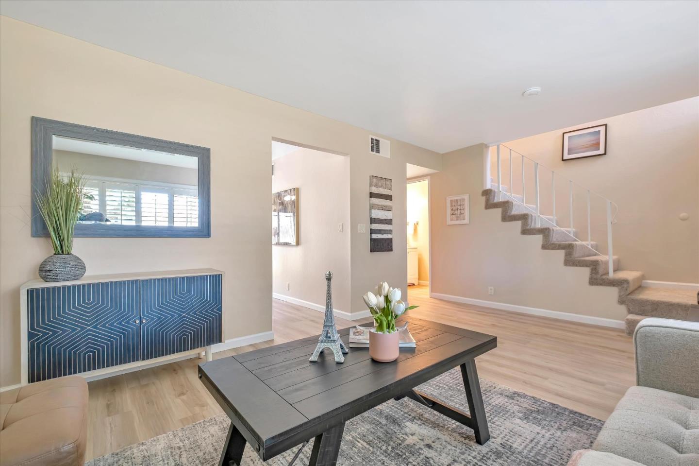 Price refresh!! Welcome to this expansive townhome, featuring 3 beds plus a versatile den/office or potential 4th bed, and 1.5 baths spread across 1,390 sq ft of living space. A detached 2-car side-by-side garage adds convenience and ease. This newly painted home showcases brand-new LVP flooring on the main level and plush carpeting on the second floor, creating a cozy and stylish ambiance.The recently remodeled kitchen shines with new stainless steel appliances and crisp white cabinets, offering ample storage. The adjacent dining area, with its glass doors leading to a patio, is perfect for meals and entertaining.The primary bedroom boasts a spacious walk-in closet and an ensuite bathroom with a shower tub and glass doors. Located in the desirable Contempo community, this home offers low HOA dues and exclusive access to swimming pools, basketball courts, and the Contempo Park. Enjoy the proximity to grocery stores like Seafood City and Island Pacific Supermarket, as well as shopping, dining, and entertainment at the nearby Union Landing shopping center. With easy access to Dumbarton Bridge and I-880, commuting is a breeze.