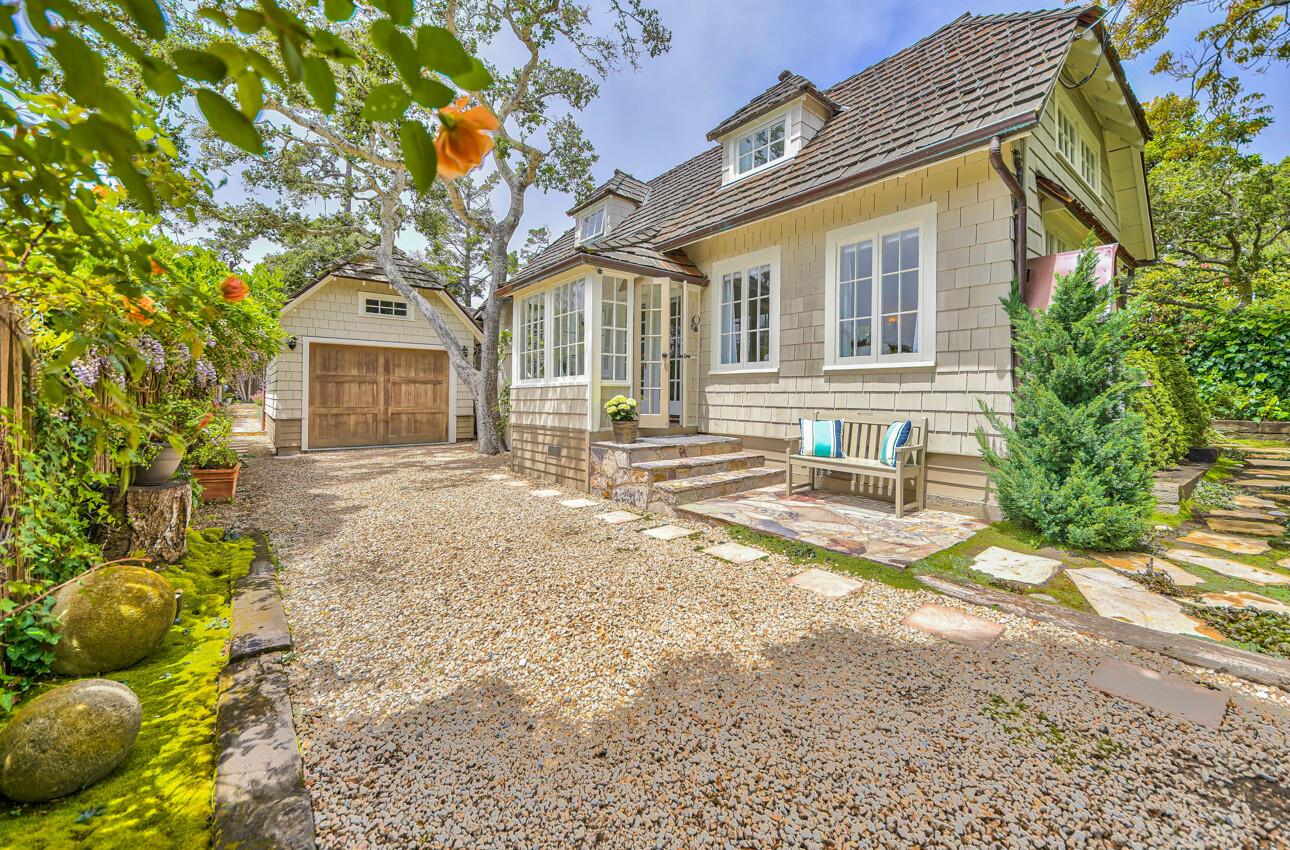 Nestled on a quaint street a block to the vibrant downtown, this property combines charm and modern luxury with an abundance of tranquil outdoor living spaces. Graced throughout with beamed ceilings, wood floors, and many windows and glass paneled doors bathing the home in natural light and showcasing the enchanting lush gardens. Porch entry into the living room with cozy gas fireplace. Kitchen boasts Wolf gas range and Blanco sink. Dining room with built-in cupboard. Dutch doors from office lead to large back patio complete with Wisteria cloaked arbor and outdoor fireplace. Main level secluded primary bedroom suite enjoys vaulted ceilings, Carmel stone fireplace and French doors to the backyard. Primary bath with double sinks. Both baths have marble counters, porcelain sinks, and large subway tiled showers. Two guest bedrooms upstairs with dormer windows. Downstairs wine cellar stays cool naturally. Attached 1-car garage. Space upstairs to add a half-bath with available water credits.