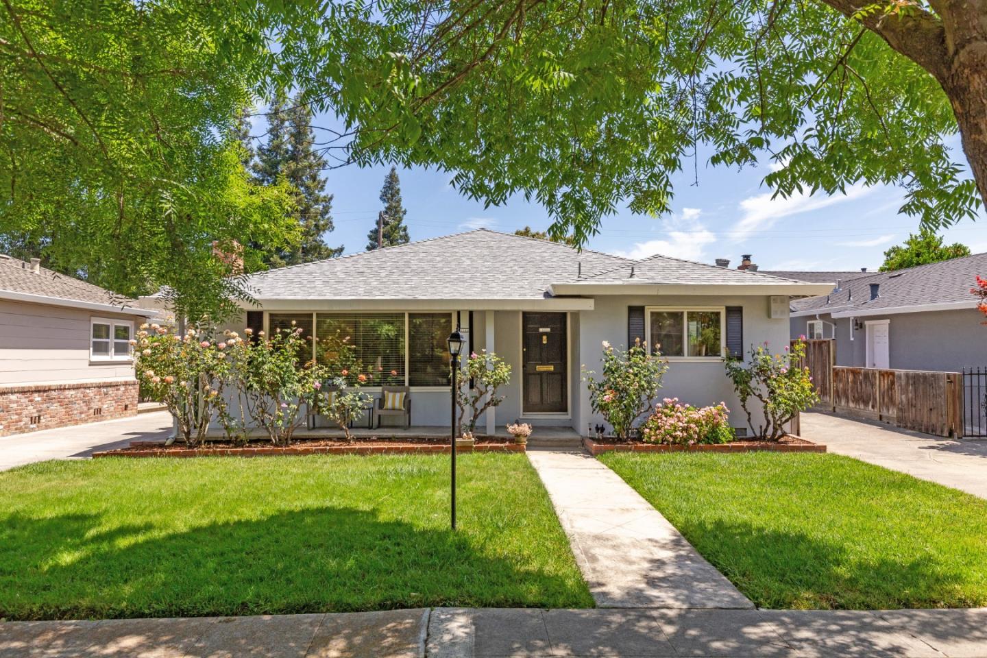 Welcome to Willow Glen! 1164 Spencer, beloved by its original owner is a great opportunity to add your personal touch while simultaneously investing in your future. This wonderful single story classic ranch home sits tucked away in a desirable tree-lined Willow Glen cul-de-sac. Beautiful curb appeal with a welcoming front porch surrounded by rose bushes. As you walk through the front door you are greeted by a front living room accented by a large picture window and cozy stone-faced gas fireplace. With central air conditioning you will be kept cool on those hot summer days! Adding to the appeal..... New roof in 2023, fresh interior paint and hardwood floors throughout. The spacious detached garage has extra storage, and the long gated driveway has space for at least 3 cars. The backyard includes both Meyer lemon & Persimmon trees along with mature landscaping. Located mere minutes from the heart of vibrant Willow Glen's fabulous shops & dining options. Easy commute routes to Highway 280 and 87