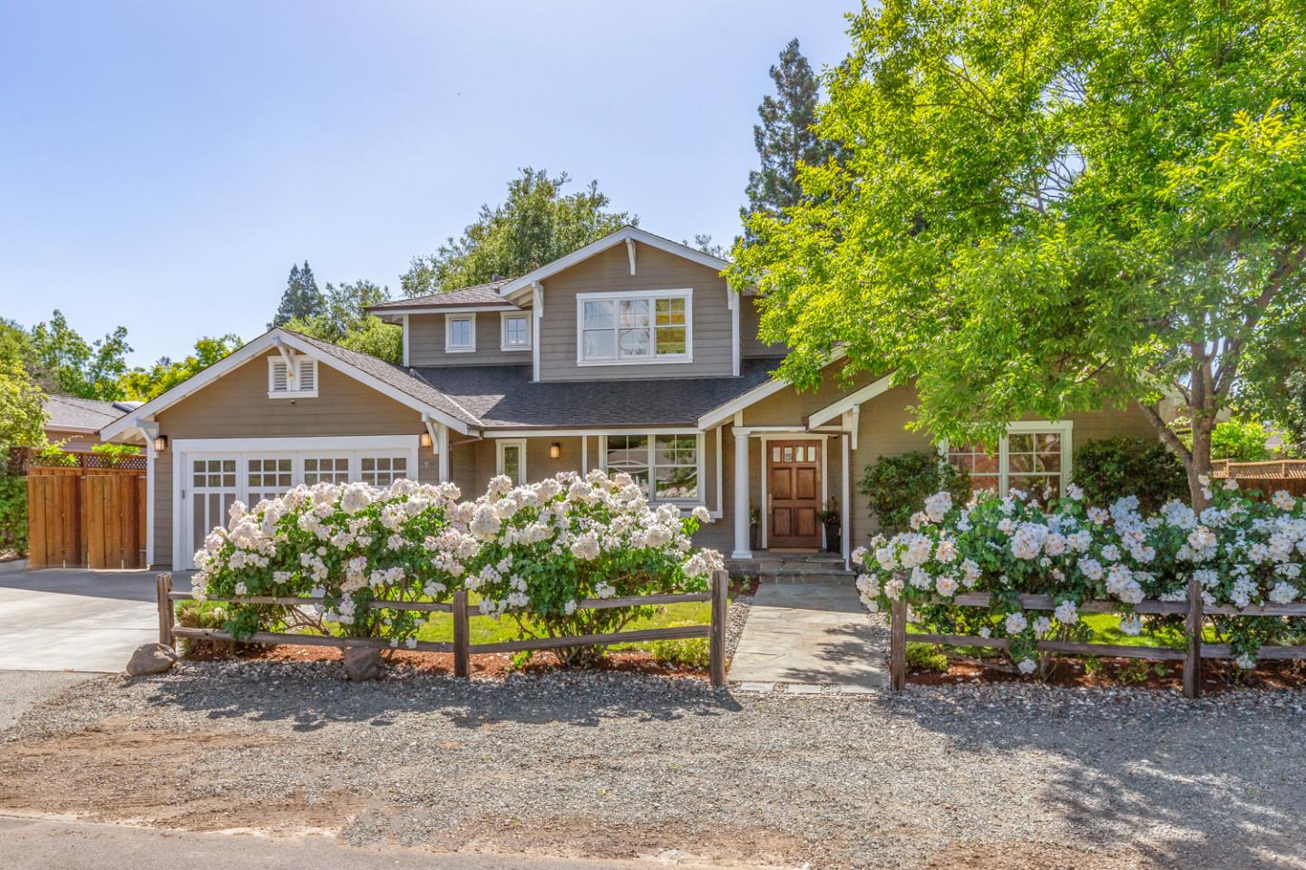 Beautifully appointed, this home offers designer style, a perfect floor plan, freshly painted interiors, gorgeous hardwood and tile floors, plus new carpet. Tremendous great room for living, dining, and kitchen with numerous glass doors to the rear yard, built-in cabinetry, and a dream kitchen with updated granite slab countertops and large island with elevated breakfast/wine bar seating. Customized mud room and full bath. Main-level primary suite opens to the rear grounds plus second suite and dedicated office with built-in retractable desk/Murphy bed for optional 5th bedroom. Upstairs lounge/family room with balcony, study center, plus two spacious bedrooms and full bath. All customized closets throughout. Owned solar for electricity and EV charging in the finished 3 car garage with significant custom cabinetry. Prime neighborhood just blocks to Rancho Shopping Center. Excellent Los Altos schools.