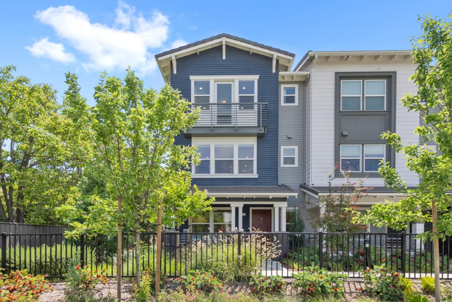 IDYLLIC CONTEMPORARY LIVING. Tucked away in a great location with an unobstructed park view, this 6-year new end-unit in the sought-after Estancia Community shines! All bedrooms are en-suite. The ground-floor bedroom is perfect for guests or home office. The second floor embraces open-concept living by seamlessly combining the kitchen, dining, and living areas. The fabulous kitchen is anchored by a large island that's as beautiful as it is functional. Check out the abundant cabinets with stylish gold accent handles and upscale Professional Series Bertazzoni appliances. This space is Infused with natural light. Step out onto the balcony for some fresh air and outdoor enjoyment. A half bath completes this floor. On the third floor is two more bedrooms. The primary bedroom with a spa-inspired bathroom enhances your daily routine. There's also a walk-in closet with organizers. The other bedroom is oversized with a full bath. Laundry is conveniently located on this floor. Hardwood/Tile/Carpet flooring and high ceilings. Integrated home automation offers built-in wireless access for every room. 2-car attached garage with Tesla charger. Located conveniently to vibrant Mountain View Downtown and easy access to shopping, commute routes, and Caltrain. Great schools.