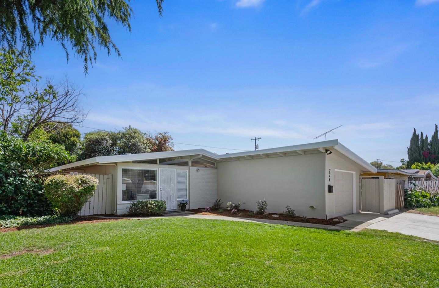 Discover this special 3 bedroom/2 bath home in Sunnyvale's Lakewood Village that seamlessly blends mid-century modern charm and tasteful updates. Conveniently located for commuting to major Silicon Valley employers, Sunnyvale Baylands Trail and only two blocks from Lakewood Park & Lakewood Tech EQ (Elementary) School. Enjoy easy access to shopping and dining at nearby Mercado Shopping Center and Santa Clara Square. The home's open beamed ceilings, laminate wood floors and freshly painted interior & exterior create a clean and inviting atmosphere. The beautifully updated kitchen features quartz countertops, new LG stainless steel sink appliances, recessed lighting, luxury vinyl tile (LVT) flooring & pantry storage. Year-round comfort is ensured with central AC/heat, Nest thermostat, ceiling fans & dual-paned windows. Parking incl one-car garage & driveway space for two vehicles. Or use the finished garage with its gleaming epoxy floor as a bonus area for work or hobbies. The thoughtfully designed backyard incl artificial turf lawn, large garden box for herbs and veggies, and lemon and cherry fruit trees. The great patio area w/retractable shades is next to the kitchen/dining area, perfect for entertaining and BBQs. It's time to make this charming home your next Home Sweet Home!